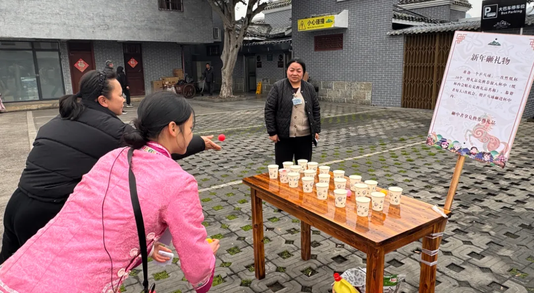 “新年砸礼物”考验精准投掷,乒乓球落杯瞬间总能引发阵阵欢呼。