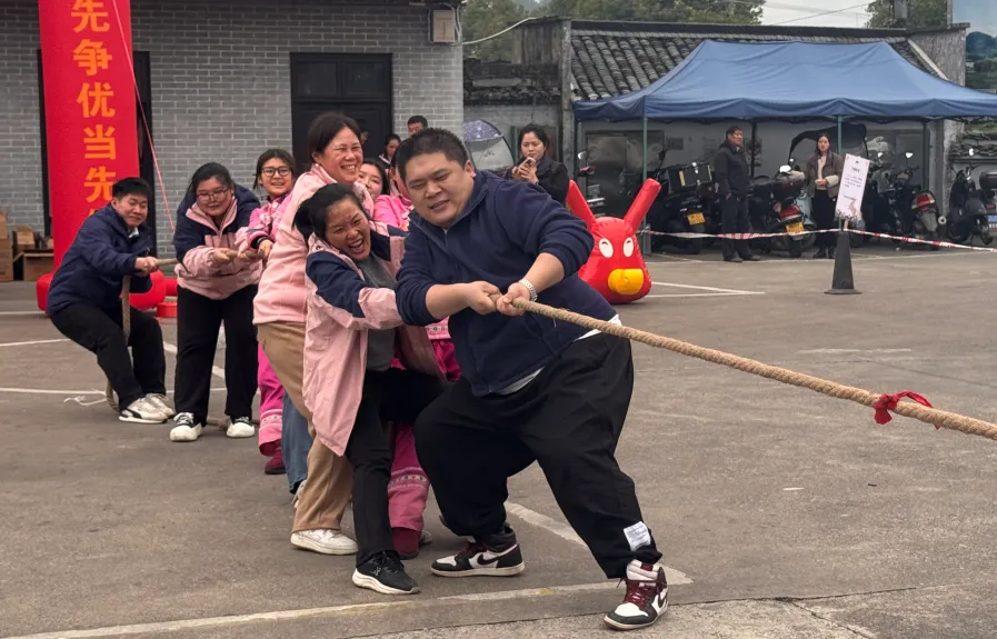 “拔河”“跳大绳”“旱地接龙”等团队项目中,大家心往一处想、劲往一处使,默契配合间尽显团队凝聚力。