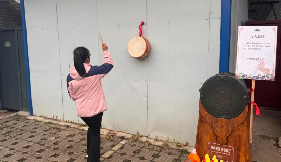 盲人击鼓凭方向感与巧劲赢取奖品,蒙眼旋转后的趣味瞄准让现场笑声不断。
