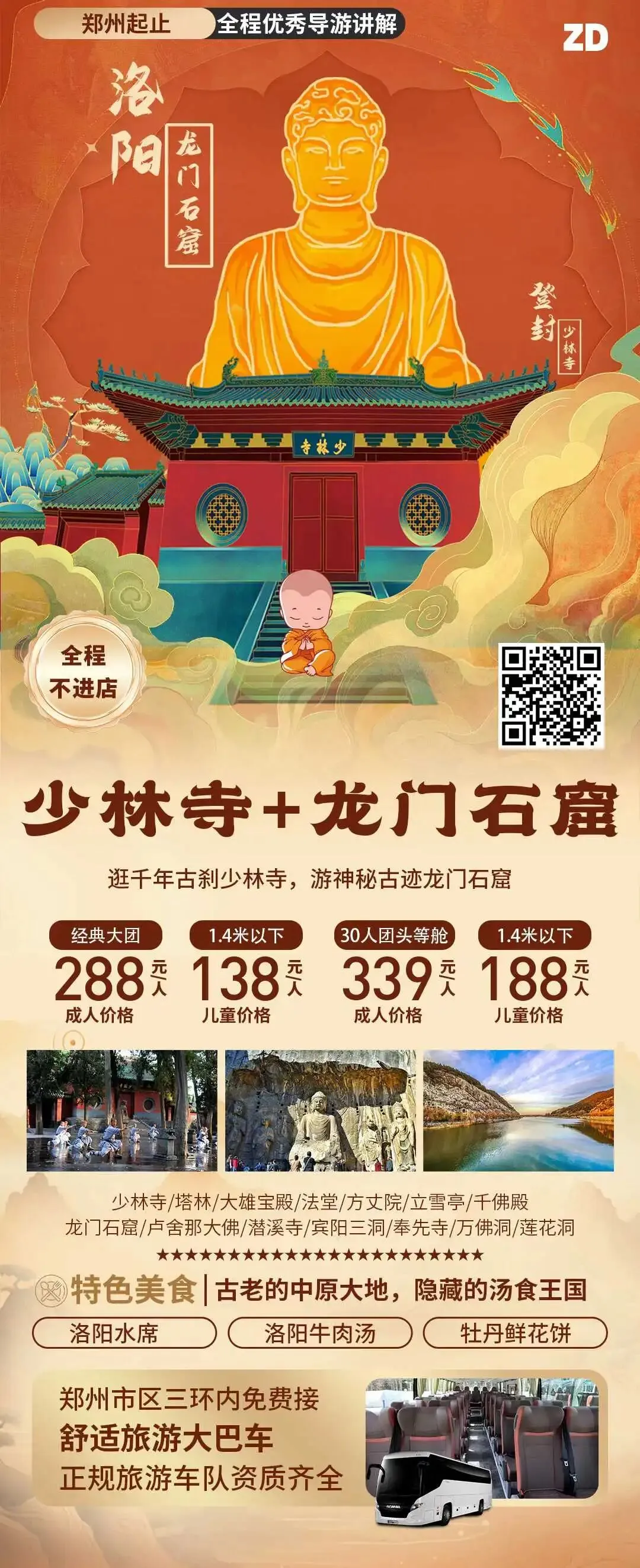 嵩山少林寺+洛阳龙门石窟一日游:288元