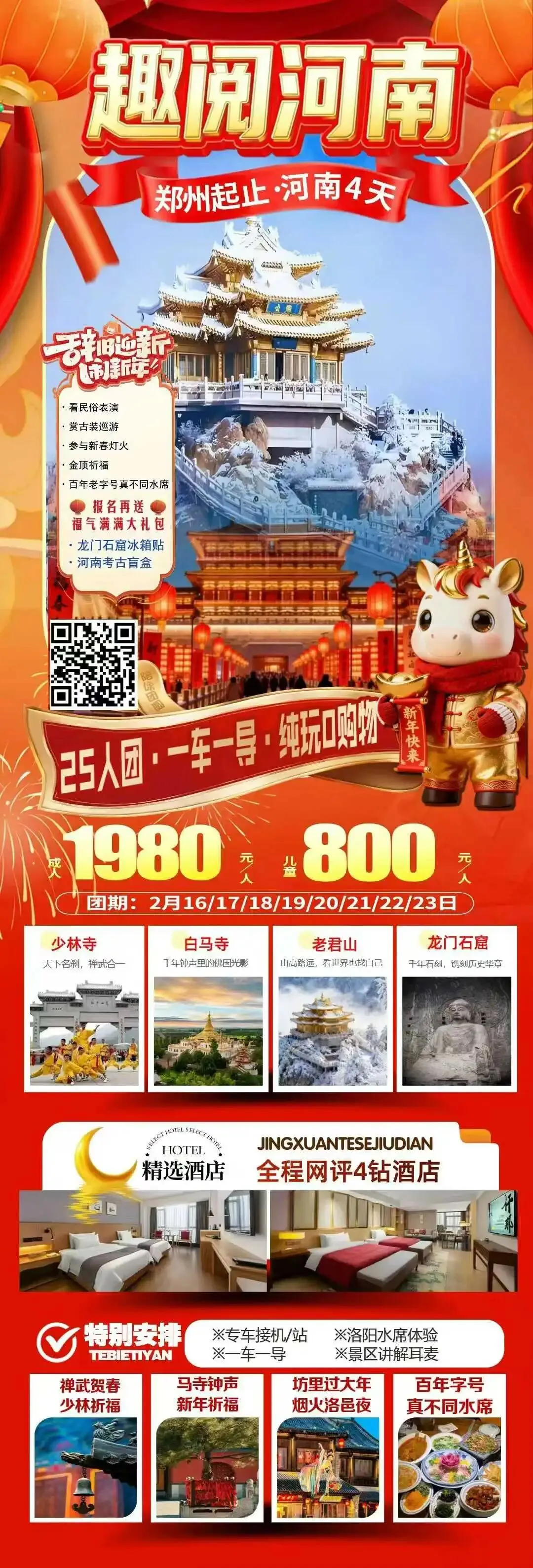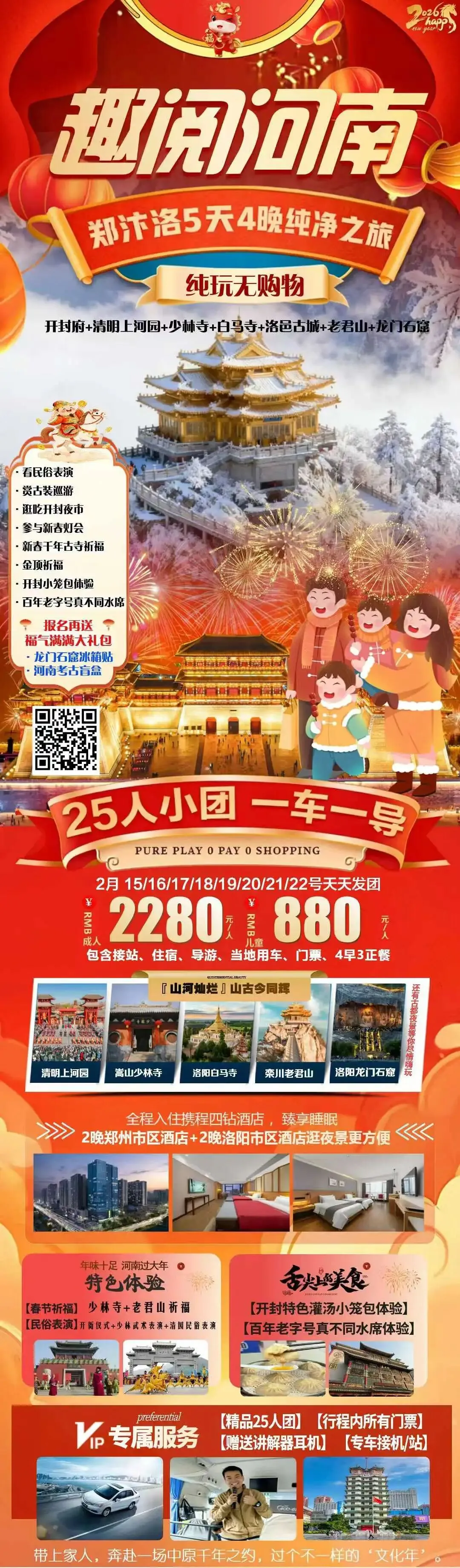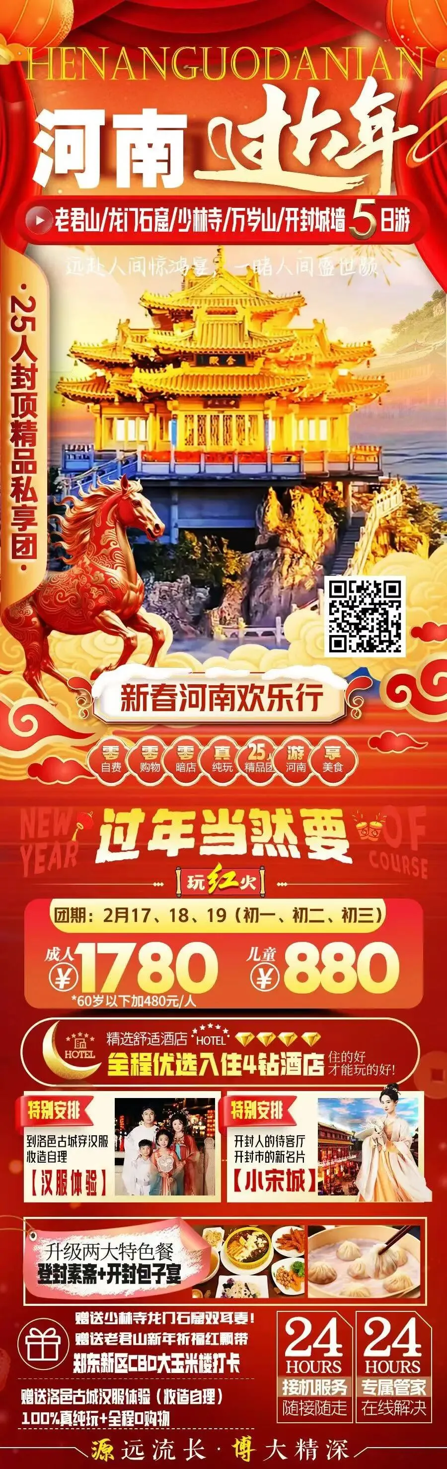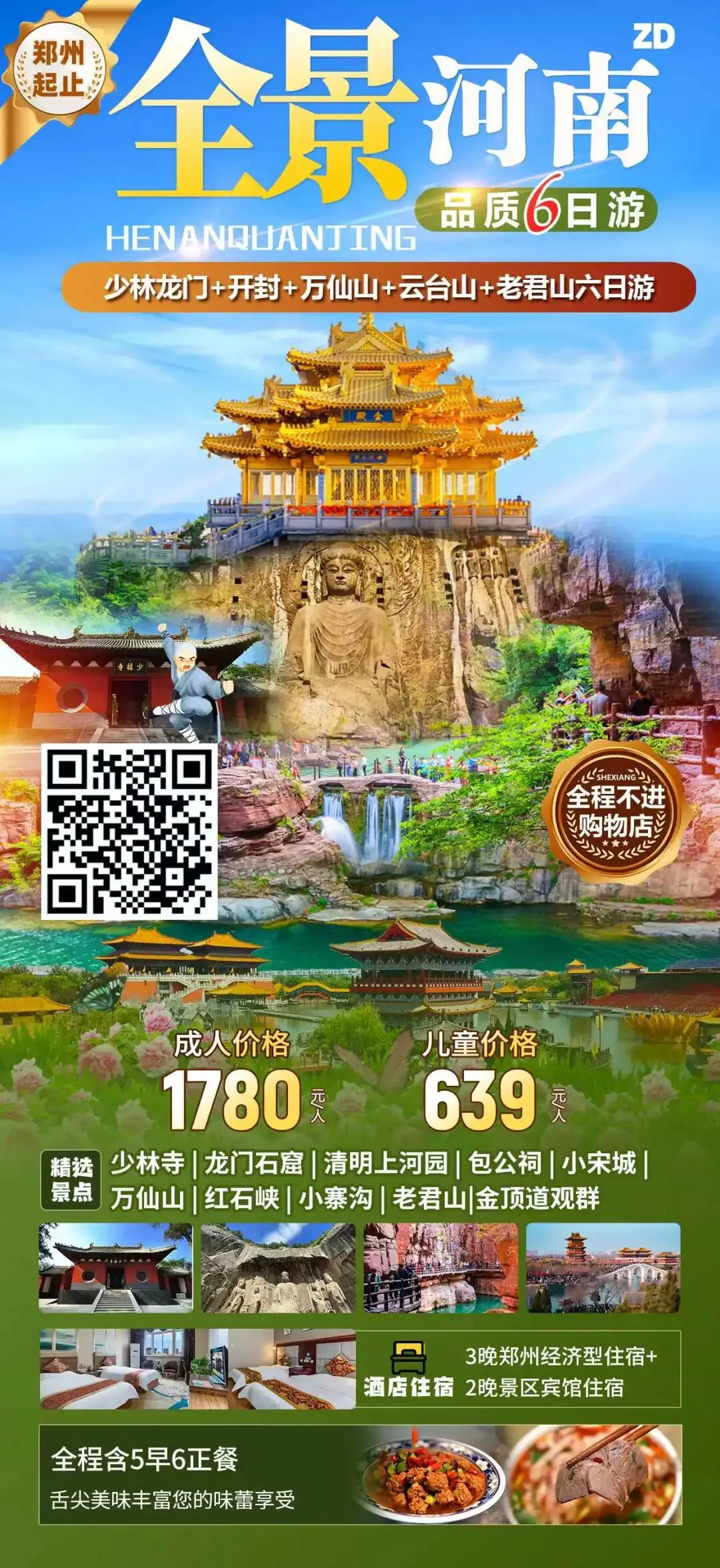 【春节河南跟团旅游】嵩山少林寺、龙门石窟、开封清明上河园、万岁山武侠城、包公祠、老君山、云台山、宝泉等一日两日多日游天天发团河南省青年国际旅行社是河南5星级旅行社:线下实体门店、质量服务有保障,出发前签署正规旅游合同,赠送旅游保险 春节跟团旅游线路:一日游、两日游、三四游、四日游、五日游、六日游等多日游天天发团 散拼团、25人精致小包团、2-9人小包团、一家一团/私家定制团均可安排