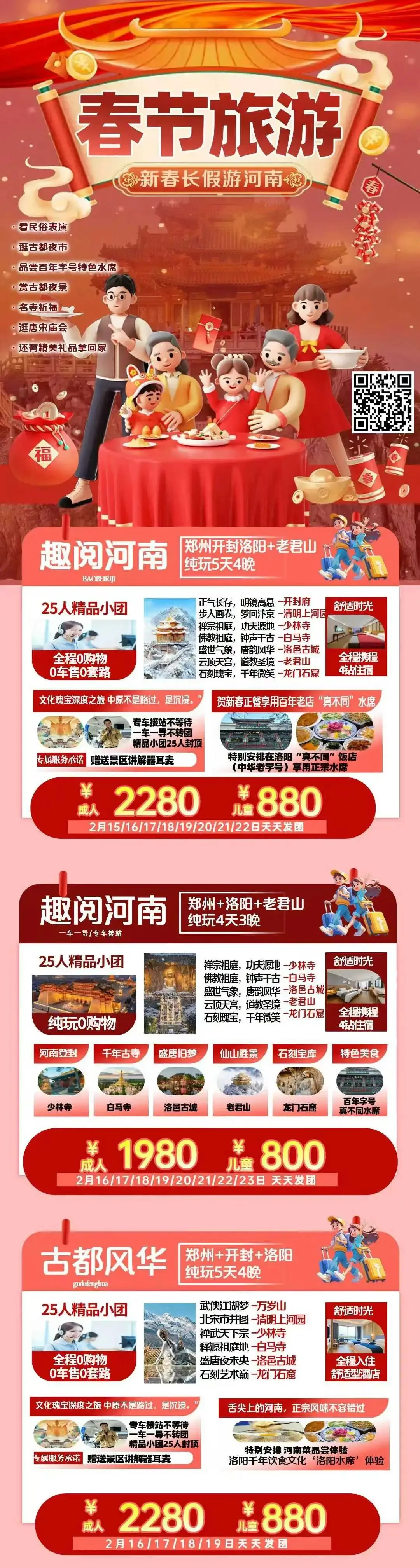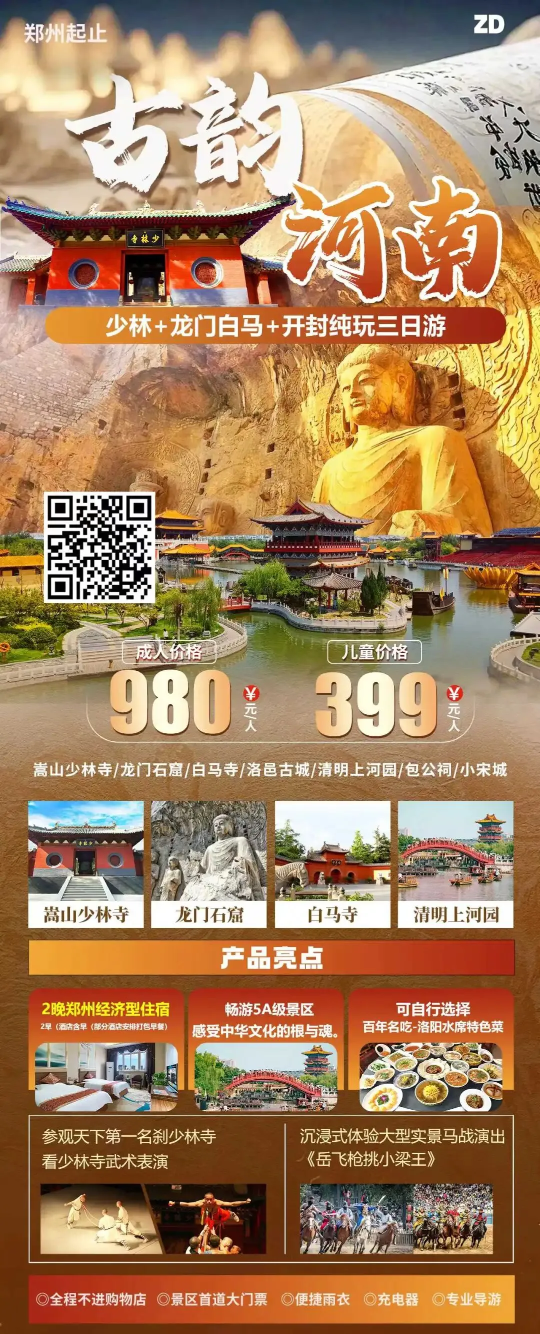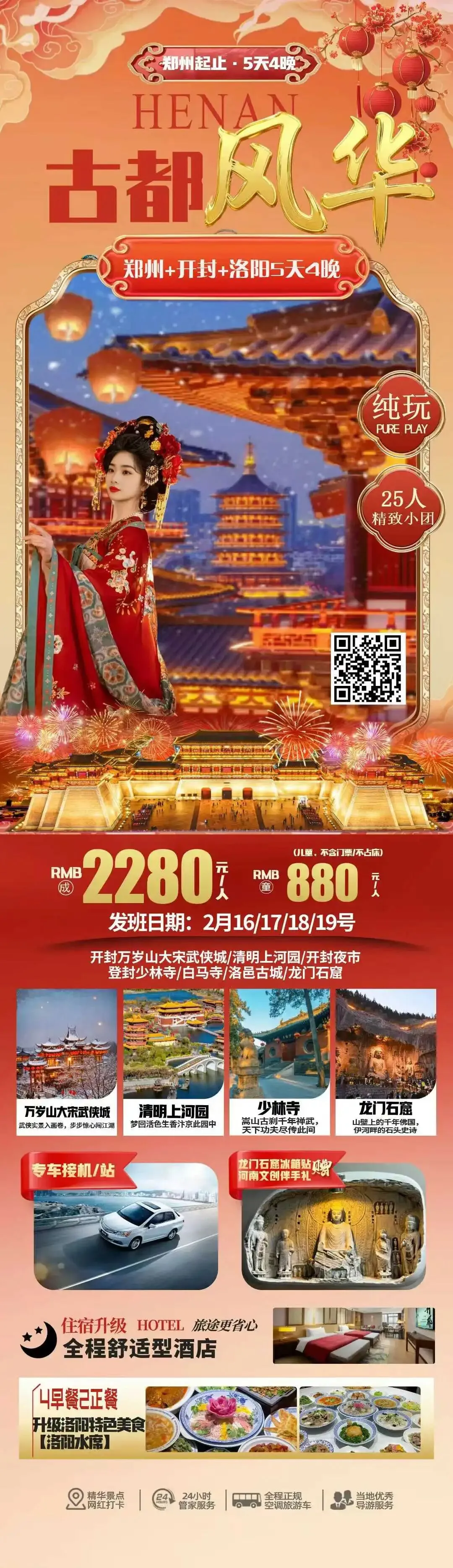 【春节河南跟团旅游】嵩山少林寺、龙门石窟、开封清明上河园、万岁山武侠城、包公祠、老君山、云台山、宝泉等一日两日多日游天天发团河南省青年国际旅行社是河南5星级旅行社:线下实体门店、质量服务有保障,出发前签署正规旅游合同,赠送旅游保险 春节跟团旅游线路:一日游、两日游、三四游、四日游、五日游、六日游等多日游天天发团 散拼团、25人精致小包团、2-9人小包团、一家一团/私家定制团均可安排