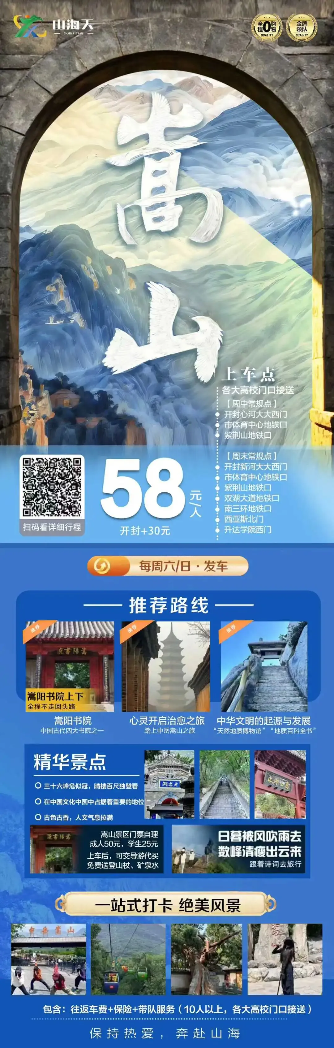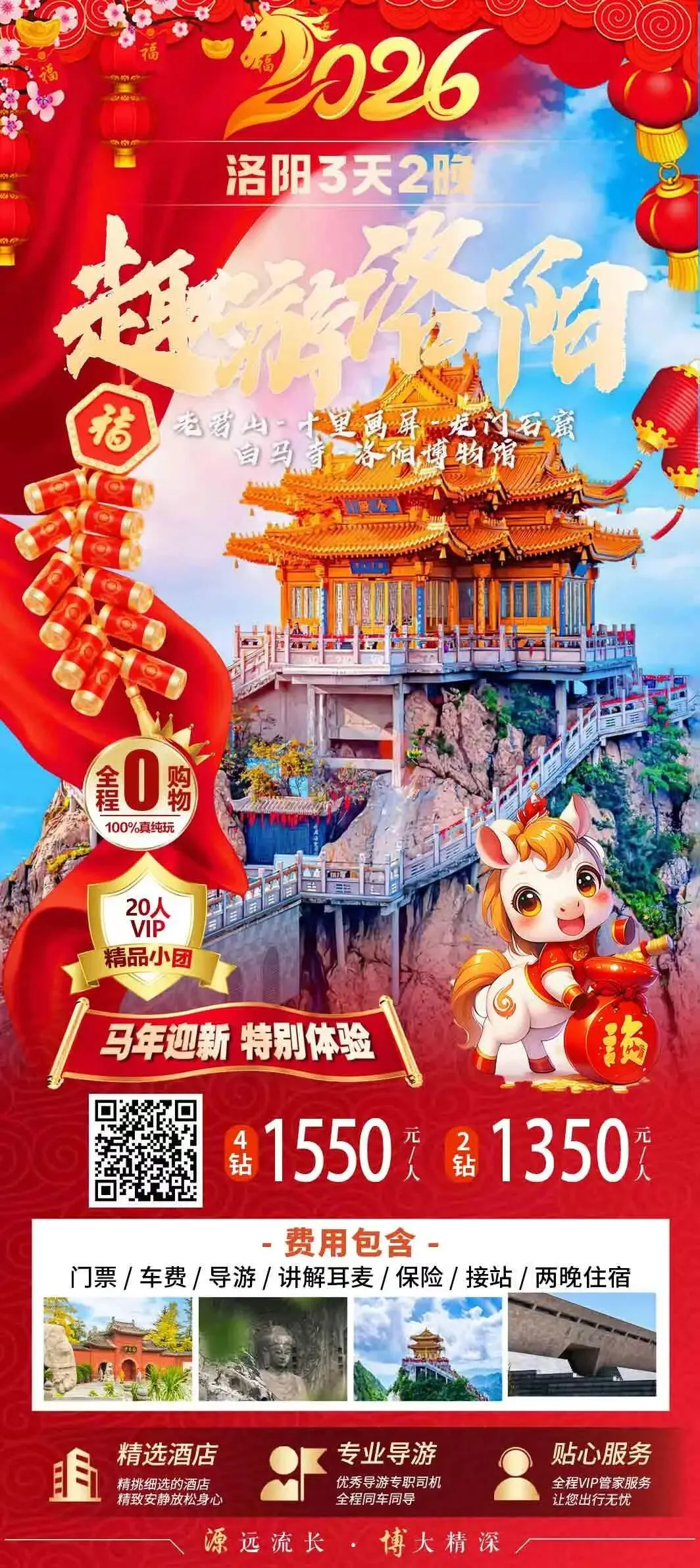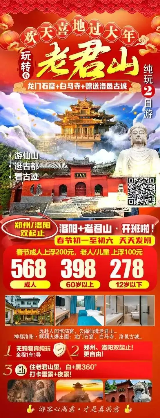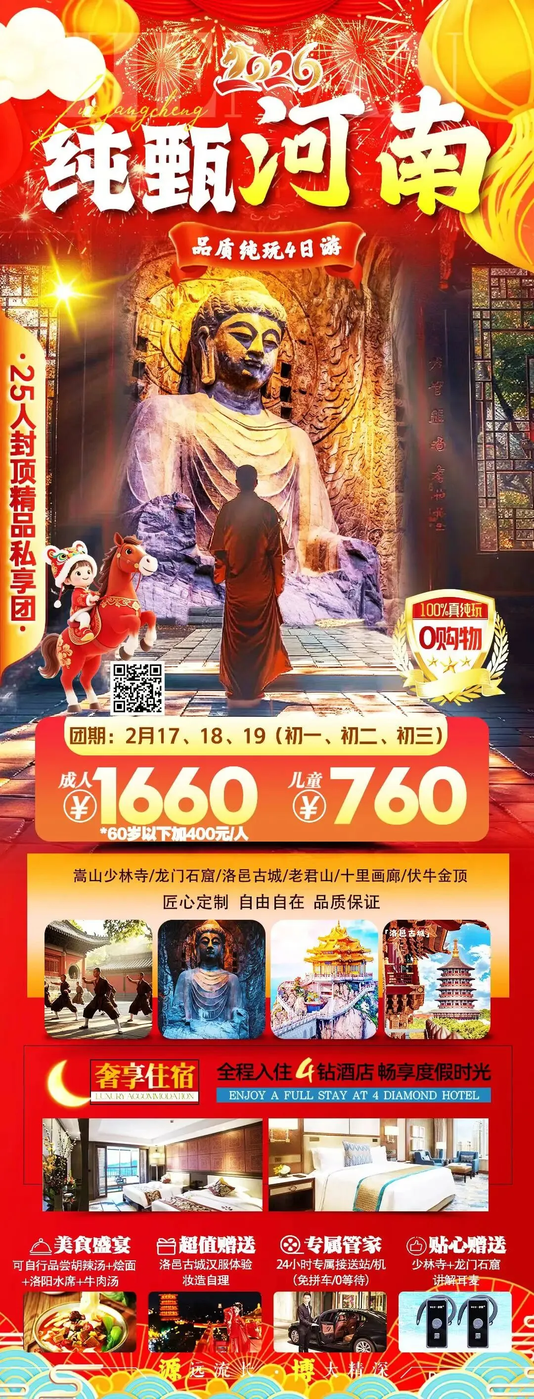 【春节河南跟团旅游】嵩山少林寺、龙门石窟、开封清明上河园、万岁山武侠城、包公祠、老君山、云台山、宝泉等一日两日多日游天天发团河南省青年国际旅行社是河南5星级旅行社:线下实体门店、质量服务有保障,出发前签署正规旅游合同,赠送旅游保险 春节跟团旅游线路:一日游、两日游、三四游、四日游、五日游、六日游等多日游天天发团 散拼团、25人精致小包团、2-9人小包团、一家一团/私家定制团均可安排