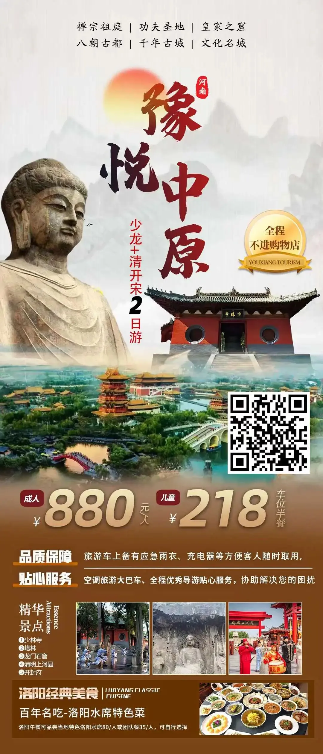 【春节河南跟团旅游】嵩山少林寺、龙门石窟、开封清明上河园、万岁山武侠城、包公祠、老君山、云台山、宝泉等一日两日多日游天天发团