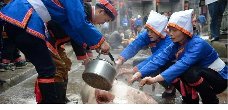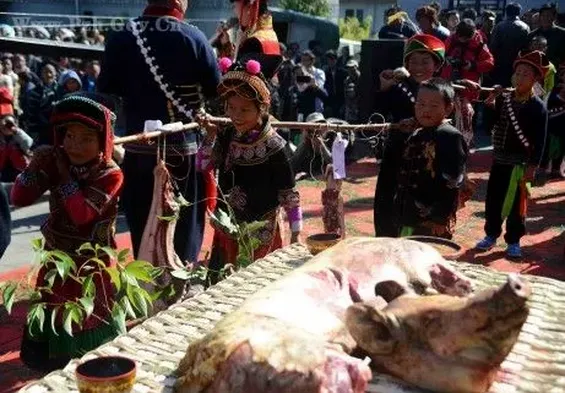 彝族除夕有“喂狗测事”“拉牛马”“招财”等活动。“喂狗测事”——吃年饭前,以饭肉混合盛于食器喂狗,若狗先吃肉后吃饭,意为来年五谷有成而六畜不旺,反之亦然。“拉牛马”——除夕深夜,各家到户外选一块大石头,绑上绳索拉回家供于神台,并向祖宗祷念:“牛马拉回来了”,意为来年禽畜兴旺。“招财”——吃年饭后,各户主稍稍潜到邻居柴堆处,拿回一二根上好木柴,示意招柴(财)进宝。