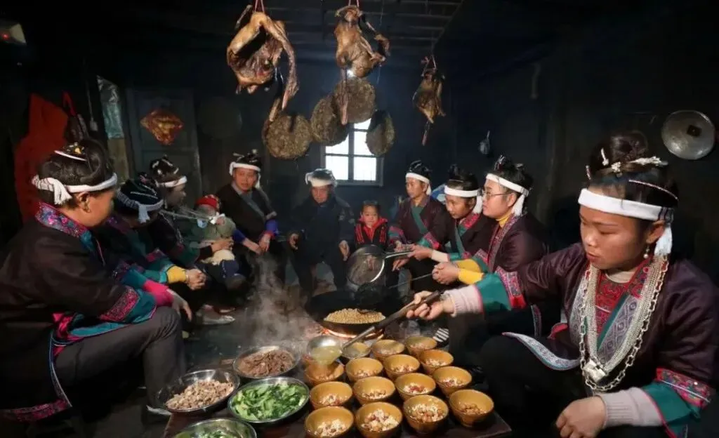 侗族除夕日,各家舂糯米糍粑,遍扫屋宇,洗涮食器衣物。扫毕,在房屋四周撒上一层石灰粉,意为清毒祛邪。有的地方有洗水井之俗。届时,各家派人对村寨的公共水井进行一次彻底的清洗,将井中的旧水舀干,清去井中的淤泥和其它不洁之物。当新年来到时,一井碧水,清澈见底。习俗认为,新年吃上干净的井水,便会吉祥如意。