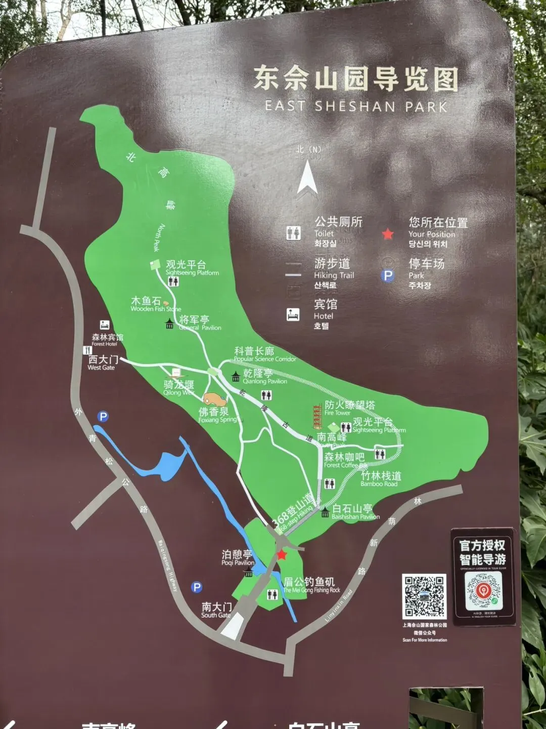 目的地很快就到。上海佘山,与其说是“爬山”,不如说是一次惬意的散步。山体不高,沿着石阶慢慢上行,一二十分钟便已接近山顶。虽少了些攀登的挑战,却多了份随心的自在。一路走走停停,吃点零食,拍几张林间漏下的光影,心情也像被山风洗过一样。