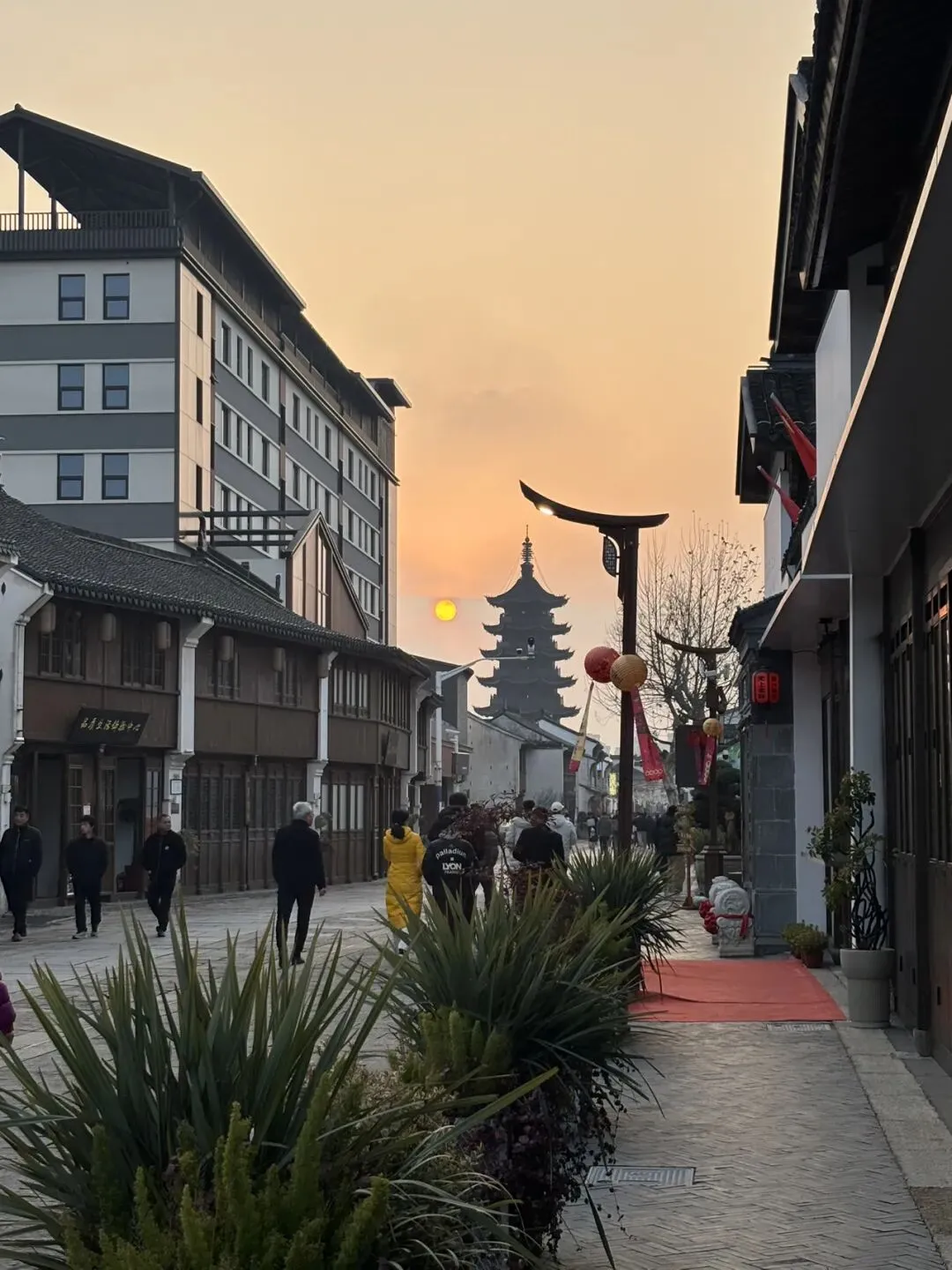踏入古镇,第一眼的感觉是“新”。白墙黛瓦的房屋整齐排列,墙面似是刻意做旧,带了些斑驳的纹理。虽少了些沧桑古意,却依然勾勒出水乡的轮廓与韵味。顺着小巷慢行,不多时便见到一座古塔静静立在镇中。正是日落时分,夕阳低垂,恰好悬在塔檐一角,橙红色的光为整座塔镀上了一层温柔的暖色。很多游人停下脚步,举起手机——这样的景致,像极了某句忘了出处的古诗。