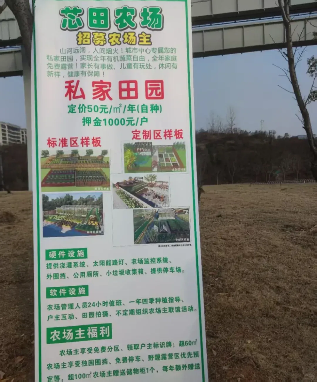 农场位于高新四路与光谷四路附近,第一期占地面积约70亩,每块菜园面积10-300平方米不等,面向社会招募农场主,定价为一年50元每平。