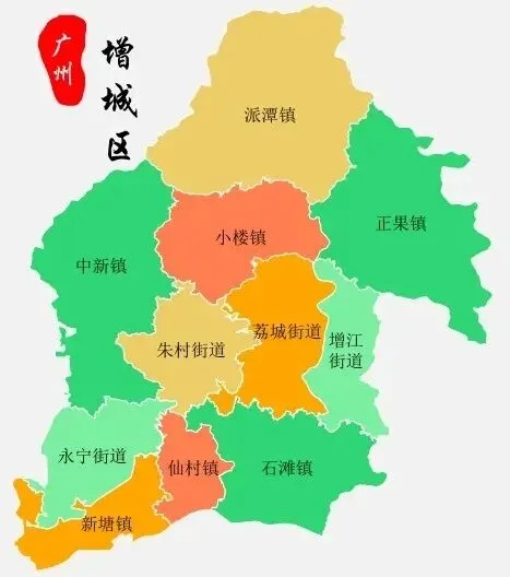 增城区下辖6个街道、7个镇:荔城街道、增江街道、朱村街道、永宁街道、荔湖街道、宁西街道、新塘镇、石滩镇、中新镇、正果镇、派潭镇、小楼镇、仙村镇,区政府驻惠民路。