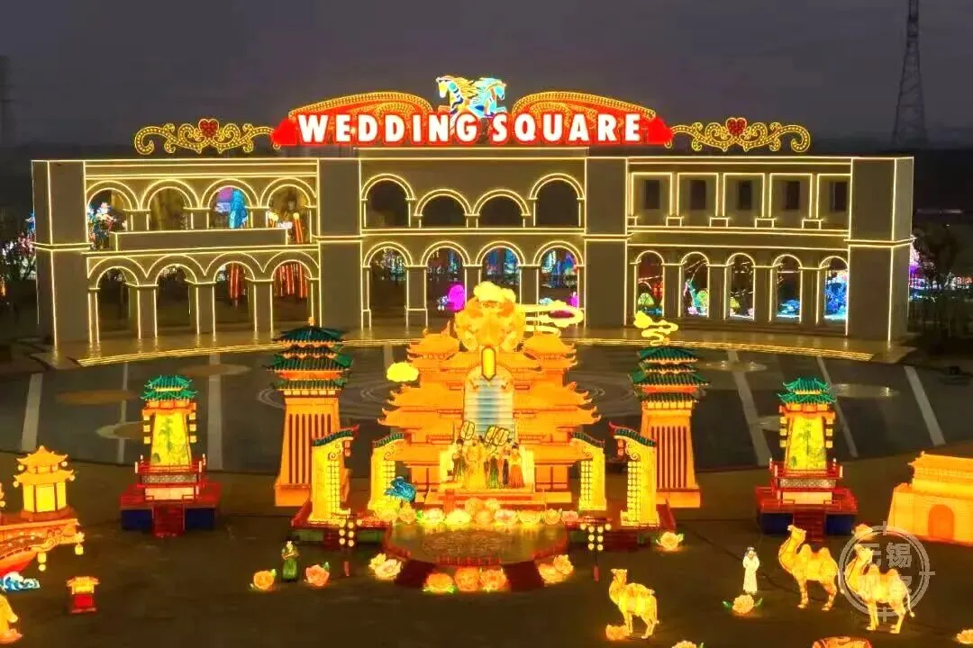 整个灯会耗用钢材超20吨,其中,仅中国馆灯组的铁架就重达8吨,坚实的骨架为后续灯组安装与效果呈现筑牢了基础。“万国来朝”区域的布置颇为震撼,抬眼望去,一座11米高的重檐飞拱建筑矗立眼前,定格胡商献宝、使节朝贡等场景,尽显大唐威仪,随手拍都是古风大片!