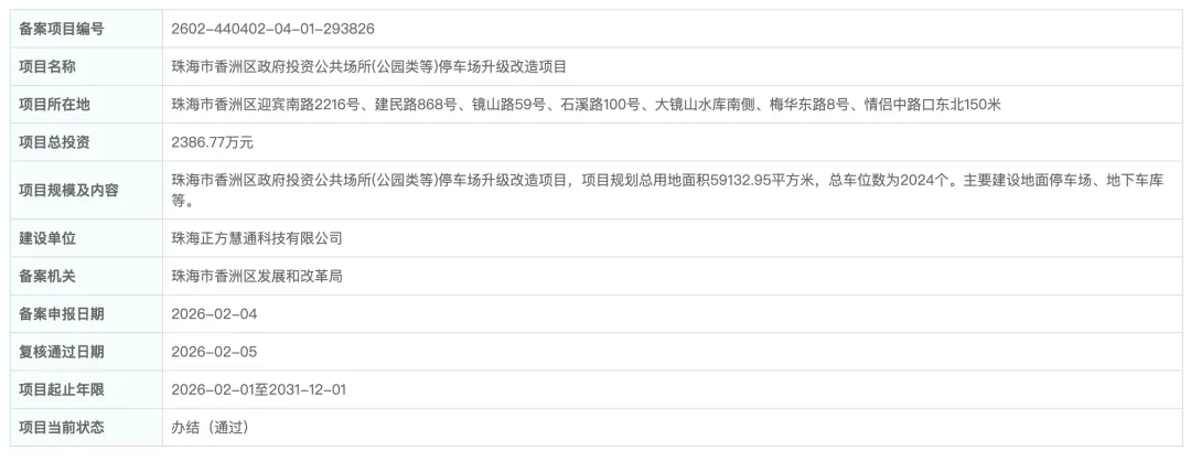 项目由珠海正方慧通科技有限公司负责建设,总投资2386.77万元,起止年限为2026-02-01至2031-12-01。
