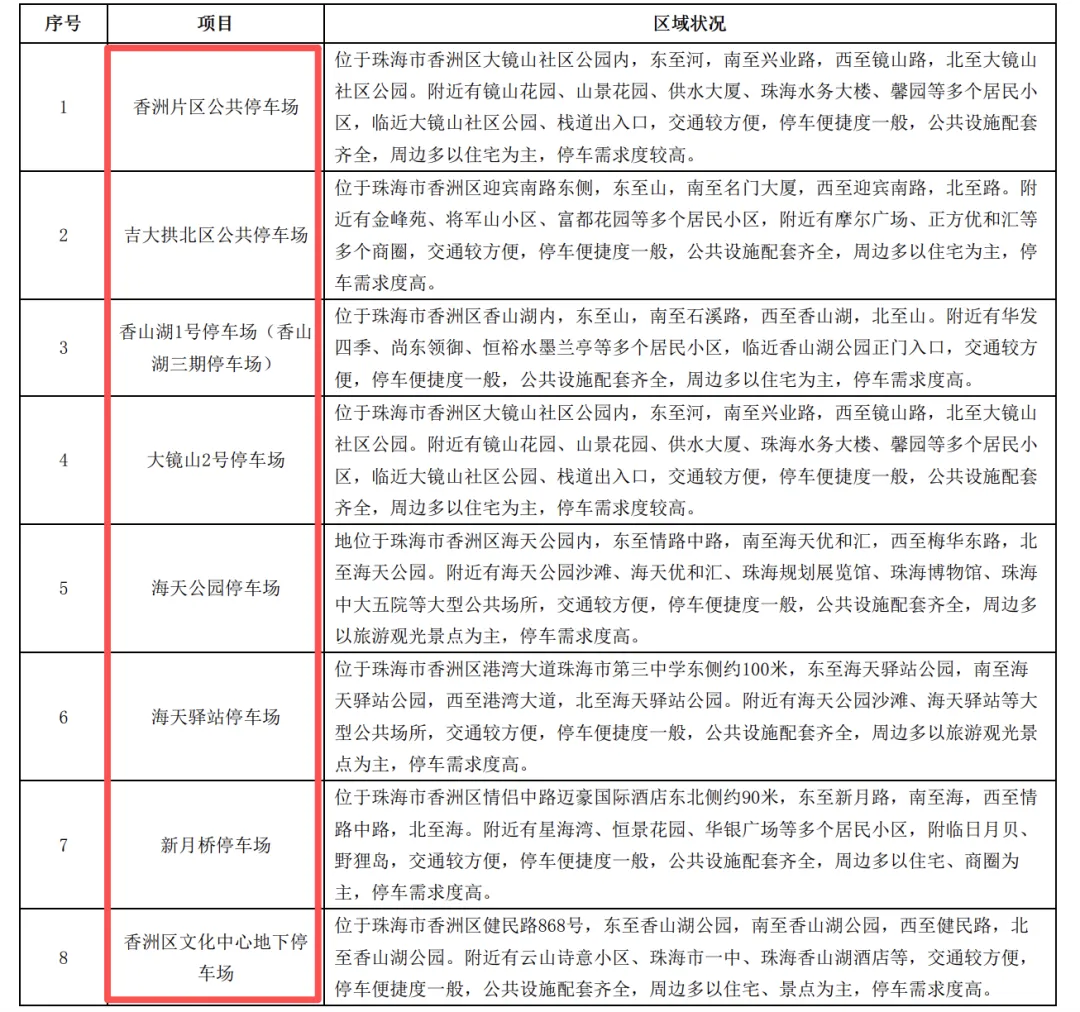 涉及停车场具体包括:香洲片区公共停车场、吉大拱北区域公共停车场、香山湖 1 号停车场(香山湖三期停车场)、大镜山 2 号停车场、海天公园停车场、海天驿站停车场、新月桥停车场、香洲区文化中心地下停车场。