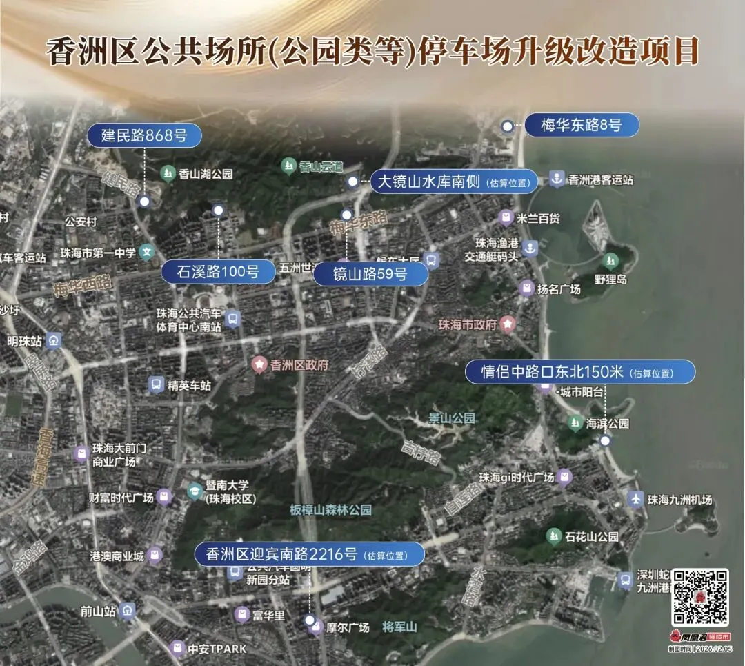本次升级改造共涉及7个点位,具体地址为香洲区迎宾南路2216号、建民路868号、镜山路59号、石溪路100号、大镜山水库南侧、梅华东路8号、情侣中路口东北150米。 从区位来看,这批停车场紧邻拱北口岸、香山湖公园、大镜山水库、海天公园、情侣路等人流密集区域,建成后将直接服务市民休闲、游客出行,有效缓解核心片区 “停车难” 问题。