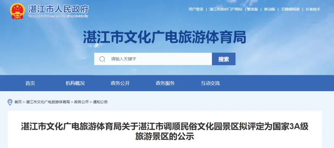 根据中华人民共和国国家标准《旅游景区质量等级划分》和《旅游景区质量等级管理办法》等标准规范,经赤坎区文化旅游体育局推荐,湛江市文化广电旅游体育局按程序组织综合评审,拟将湛江市调顺民俗文化园景区评定为国家3A级旅游景区,现予以公示。