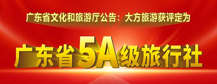 这是大方旅游继连年获评“全国百强”和“广东百强”旅行社后,再获省文旅厅目前最高等级认证——5A级旅行社!至此,大方旅游成为全省为数不多的“双百强”5A级旅行社!这是对大方旅游综合服务能力与经营管理水平的官方认证。