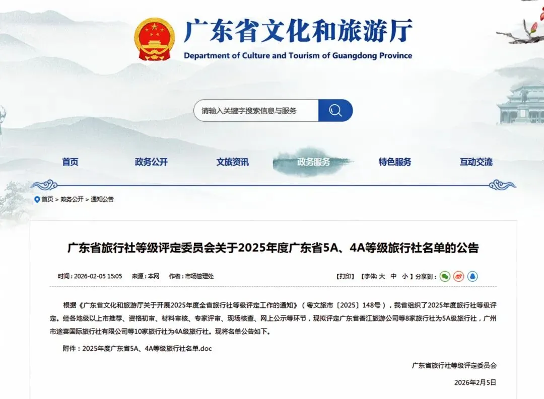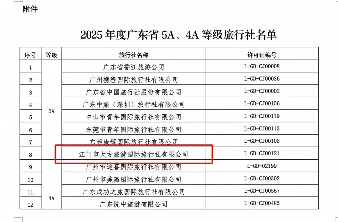 今日,广东省文化和旅游厅正式发布公告:江门市大方旅游国际旅行社有限公司获评定为广东省5A级旅行社!