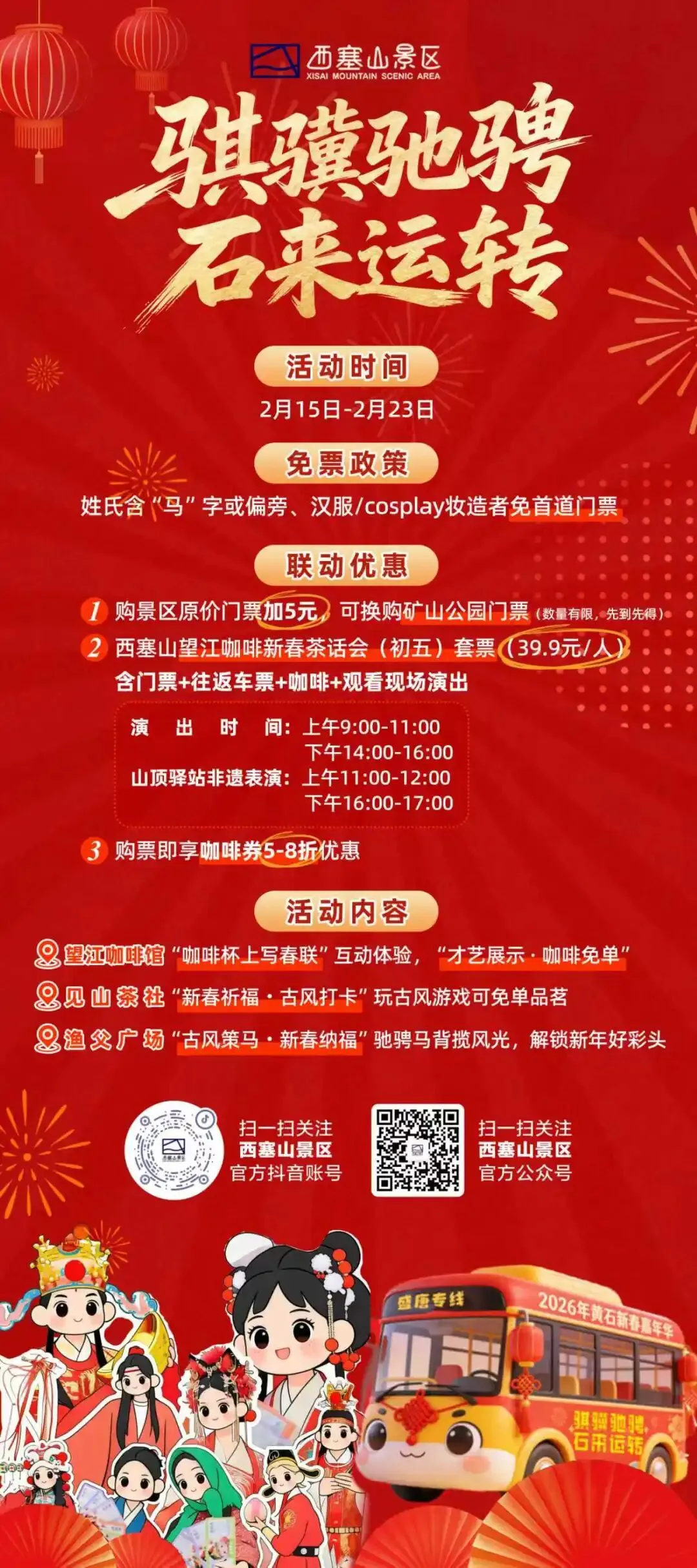 免票政策提前知:姓氏含“马”字或“马”字旁、身着汉服/cosplay妆造的游客,2月15日-2月23日可免首道门票入园;
