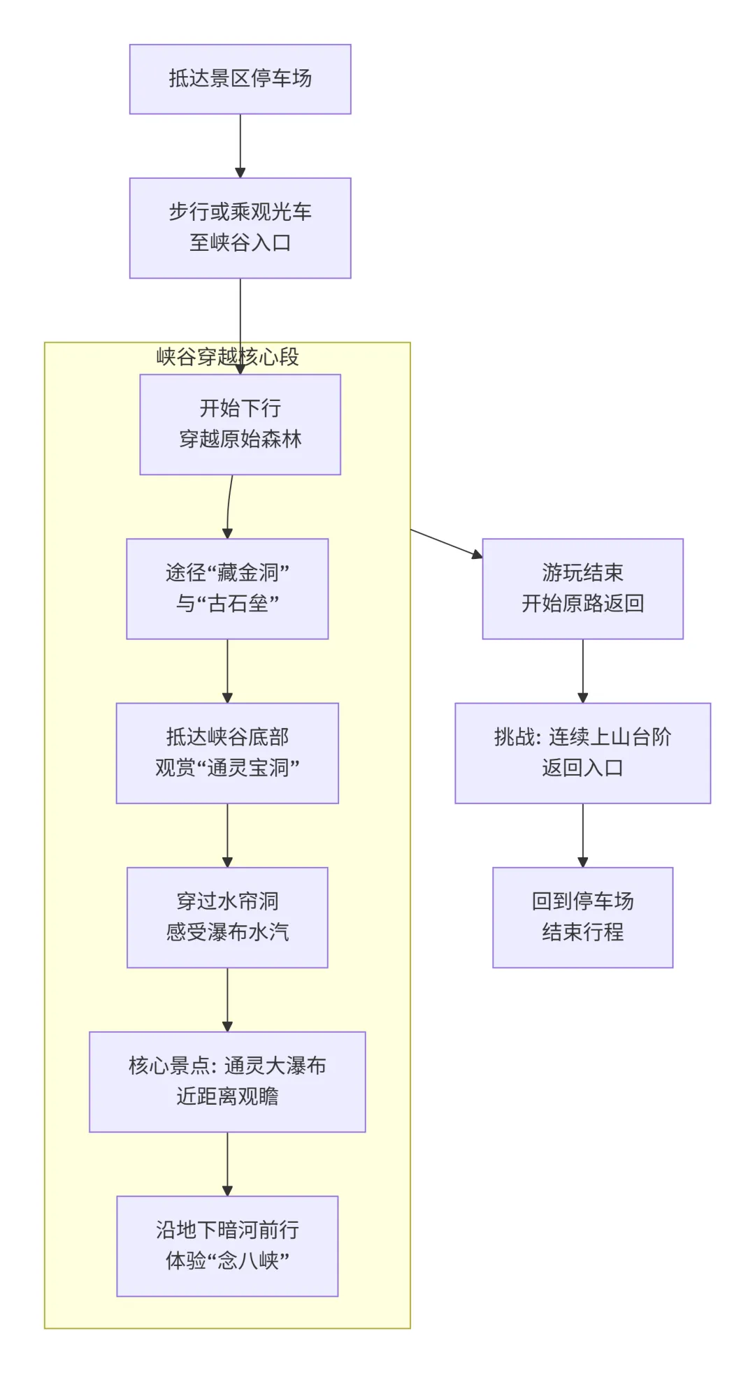 下图清晰地展示了通灵大峡谷的单向往返路线与核心景观节点,让你一目了然: