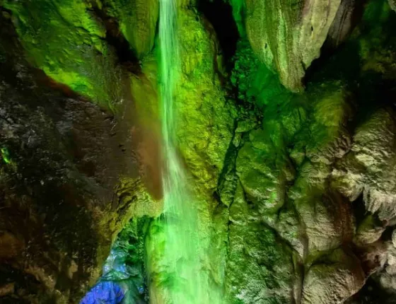 游玩步骤:从瀑布下穿过,即可进入通往地下暗河的洞穴,里面钟乳石林立,灯光点缀,仿佛进入另一个神秘世界。