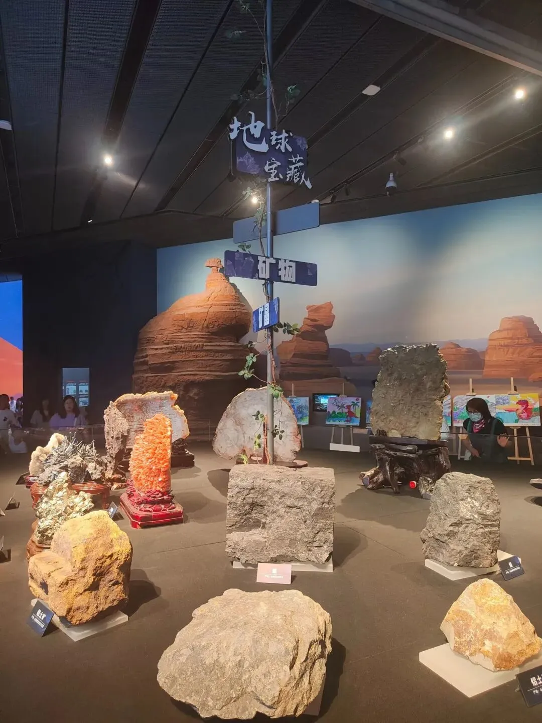作为展览序列的起点,重点讲述宇宙起源、地球形成与内外动力地质作用。展厅内设有光电太阳系动态景观,陈列来自青藏高原的系列化石、各类陨石、自然金、萤石、和田玉等矿物标本,以及岩浆岩、沉积岩、变质岩等典型岩石,系统展示了地球的宏观演化与物质组成,让观众感受宇宙的浩瀚与地球的威严。