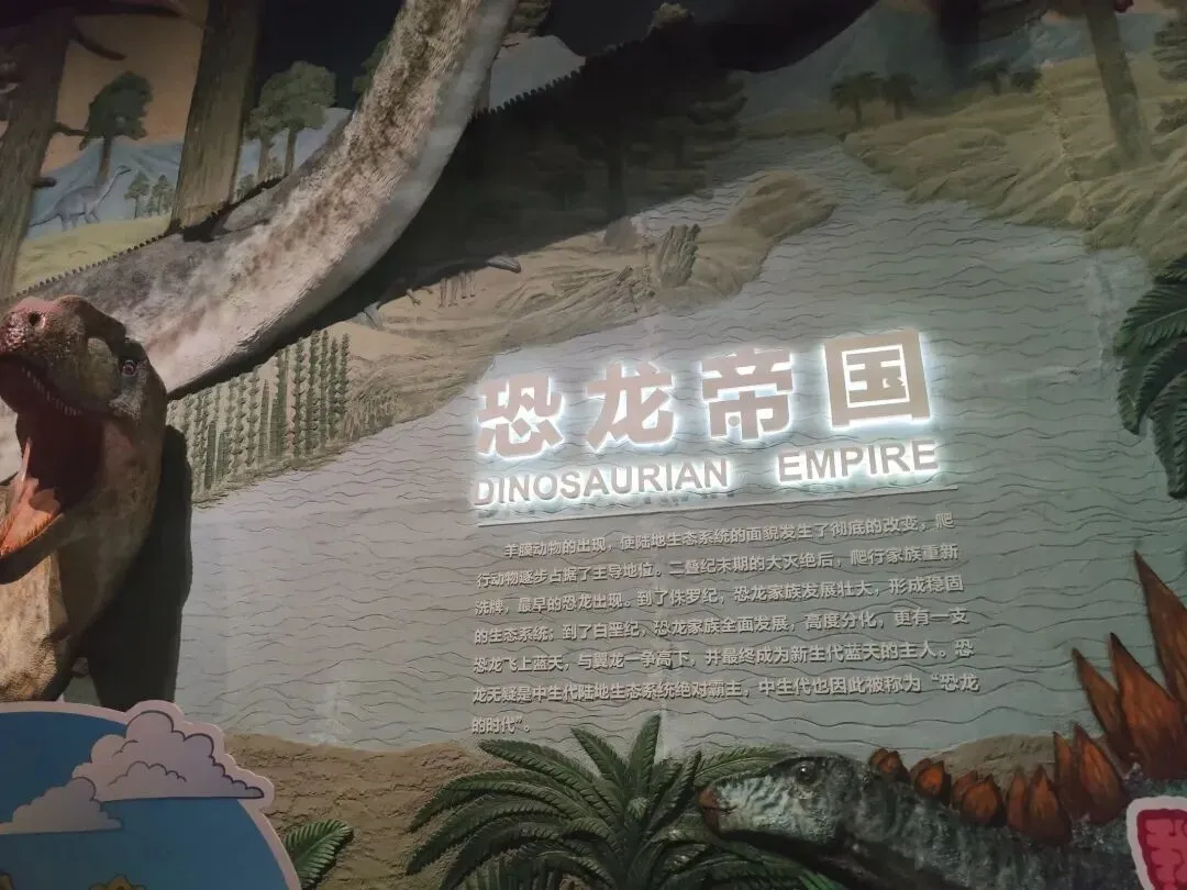 以中生代为主要舞台,系统讲述恐龙家族自三叠纪出现、侏罗纪发展壮大至白垩纪高度分化的兴衰史,以及恐龙向鸟类演化的过程。展厅通过化石遗骸、遗迹与精美复原模型,再现多样的恐龙生活场景。镇馆之宝——全世界唯一一件接近完整的中华猛龙骨骼标本即陈列于此,同时展出的还有中加马门溪龙颈椎、天山哈密翼龙蛋、水龙兽头骨等具有极高科学价值的珍稀化石。