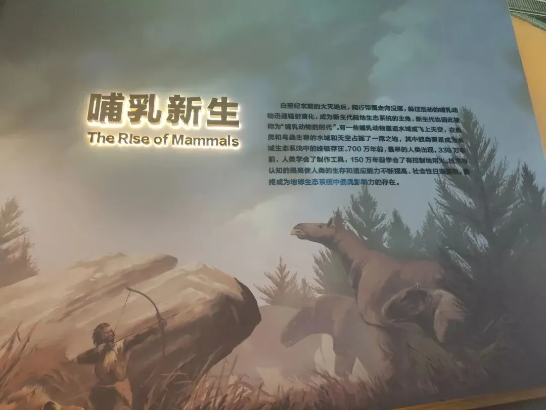展示了哺乳动物在躲过白垩纪末大灭绝事件后,于新生代辐射演化并最终崛起的过程,包括人类谱系的演化之路。展厅集中展示了埃氏马、伊朗犀、猛犸象等各类哺乳动物群的代表性化石,并配以相应的生态环境背景画,通过多媒体设备详细解读各类群的分类、演化及生态习性。