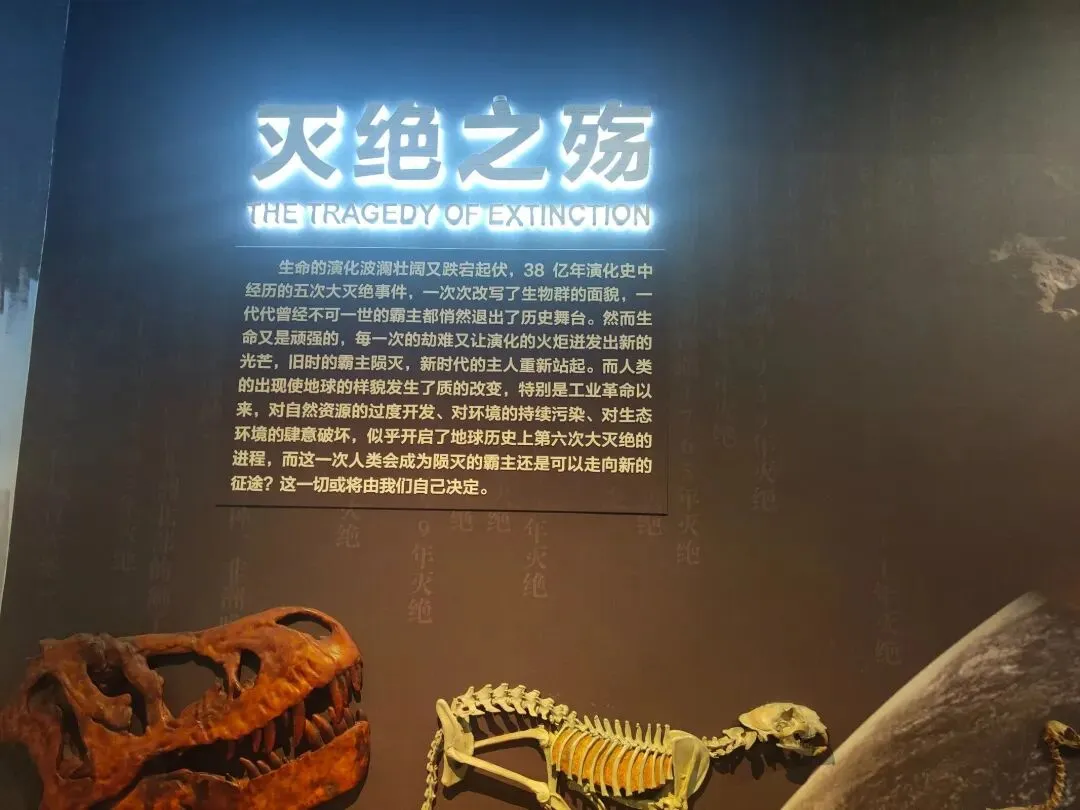 深刻反思了物种灭绝这一生命史上的沉重话题。展厅在回顾地球历史上五次大规模生物灭绝事件的同时,着重揭示了工业革命以来,因人类活动导致的物种加速灭绝现象。通过展示动物制品、渡渡鸟与恐鸟等六十多种已灭绝动物的形象,以及揭示生物入侵的危害,直观警示人类对自然的影响,呼吁保护生物多样性。