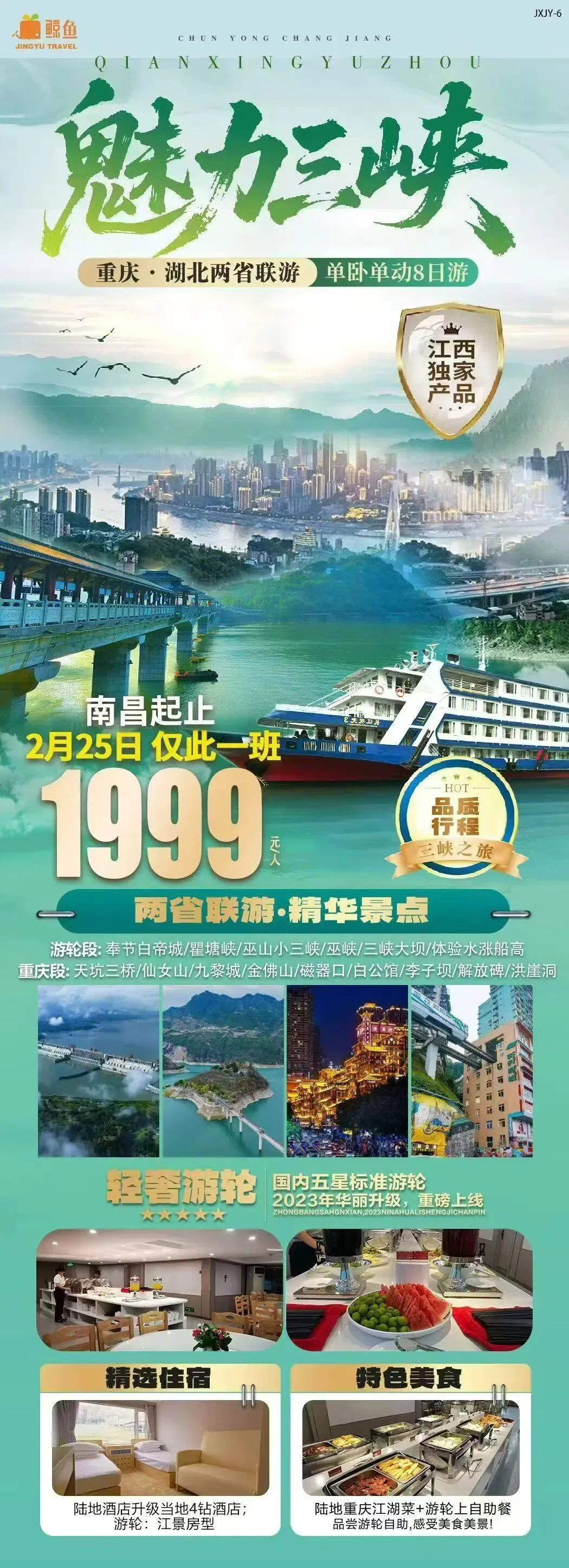 您现在的位置是:首页 > 国内旅游目的推荐 > 正文 国内旅游目的推荐 【潮人旅游】魅力三峡,重庆·湖北两省联游单卧单动8日游 admin2026年02月05日 20:44:15国内旅游目的推荐9 【潮人旅游】魅力三峡,重庆·湖北两省联游单卧单动8日游🛳️【魅力三峡】重庆·湖北两省联游单卧单动8日游🔥2月25日名额不多仅此一班,火热报名中~🔥🌆 两省联游·三峡、重庆、武隆多景点串游🚢 轻奢游轮·五星体验入住五星豪华游轮,江景阳台房推窗即览三峡盛景,船上还提供自助美食、歌舞表演,躺着就把美景看遍🍽️特色美食品尝重庆火锅、武隆竹笼宴、九黎城长桌宴江西独家产品,满25人派全陪哟~~☎️18107050172(微信同号)咨询电话:18107050172(微信同号)长按添加咨询也欢迎进店咨询信息发布 广告宣传旅游交友 婚姻介绍都可以来奉新信息网↓↓咨询电话:18107050172、15079532799 转载请说明来源于"旅荐网",部分内容转载自网络,如有侵权请联系qlwl@foxmail.com删除 本文地址:https://www.15386.cn/post/94833.html 上一篇 (附解读)广西壮族自治区文化和旅游厅等10部门印发《关于支持演唱会(音乐节)经济发展的若干措施(试行)》的通知 下一篇 我县召开2026年文化旅游发展大会 相关文章 杭州旅行全攻略 甘南环线|西北小众旅游攻略~ 河南:关于征集“人工智能+文化和旅游”应用场景的公告 香港澳门4天3晚旅游详细攻略 旅游攻略 | 浙江绍兴春日私藏地图:从张村樱花谷到安昌古镇,解锁最地道的江南 第比利斯办电话卡 | 格鲁吉亚旅行攻略② 青岛9个热门旅游景点门票攻略汇总!(2026年3月实时情况更新)| 青岛 超详细杭州两天一晚旅游攻略(人均500)直接抄!!! 必看!新野津湾桃花旅游攻略来啦:沉浸式演出、歌超、猴艺、美食、摔跤... 一口巧克力解锁比利时!旅游签证攻略手把手教你出发 发表评论 取消回复 评论列表 这篇文章还没有收到评论,赶紧来抢沙发吧~