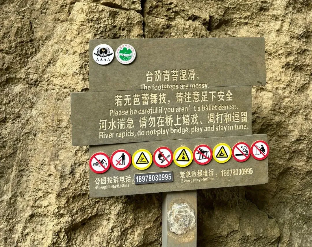 在湿滑的洞穴河边,它不说“严禁”,而说“若无芭蕾舞技,请注意足下安全”。让人会心一笑,但警告的意思全收到了。