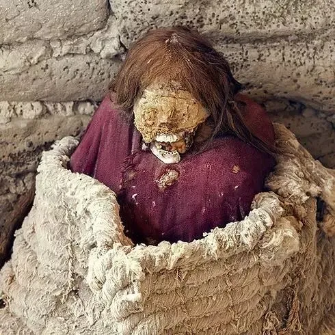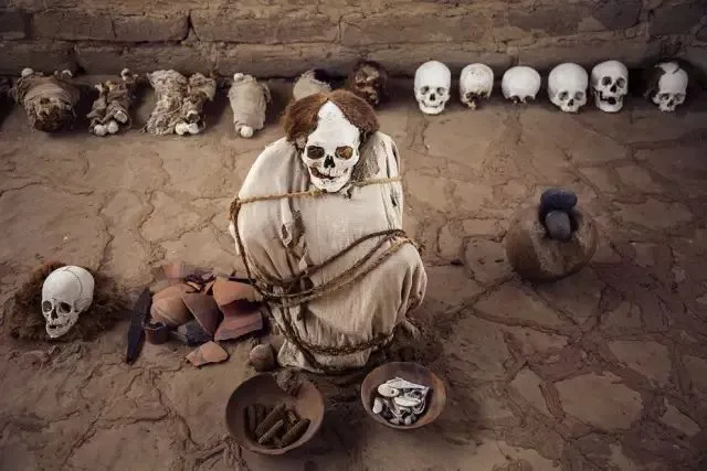 这个朝奇拉墓地位于秘鲁纳斯卡南方30公里处。由于纳斯卡地区气候干燥,这些木乃伊保存完好,不但保留了头发、骨骼,有部分木乃伊还有皮肤。