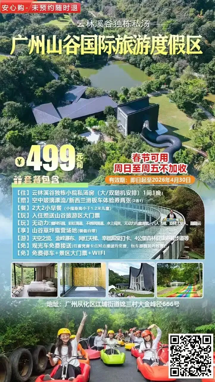春节可用!¥499入住【广州·山谷国际旅游度假区】云林溪谷-独幢小院私汤房,玩空中玻璃漂流/新西兰滑板车体验券两张(2选1)+大2小早餐