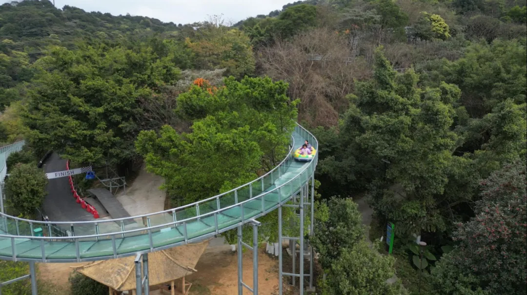 玻璃滑道依山而建,蜿蜒起伏,宛如巨龙盘居在翠绿的群峰竹林之上;置身半空中就有一种瑟瑟发抖的感觉,在玻璃滑道中悬空高速漂过两侧山野,居高临下,脚下高山流水、两岸风光无限,惊险刺激,让你叹为观止,尖叫不断。