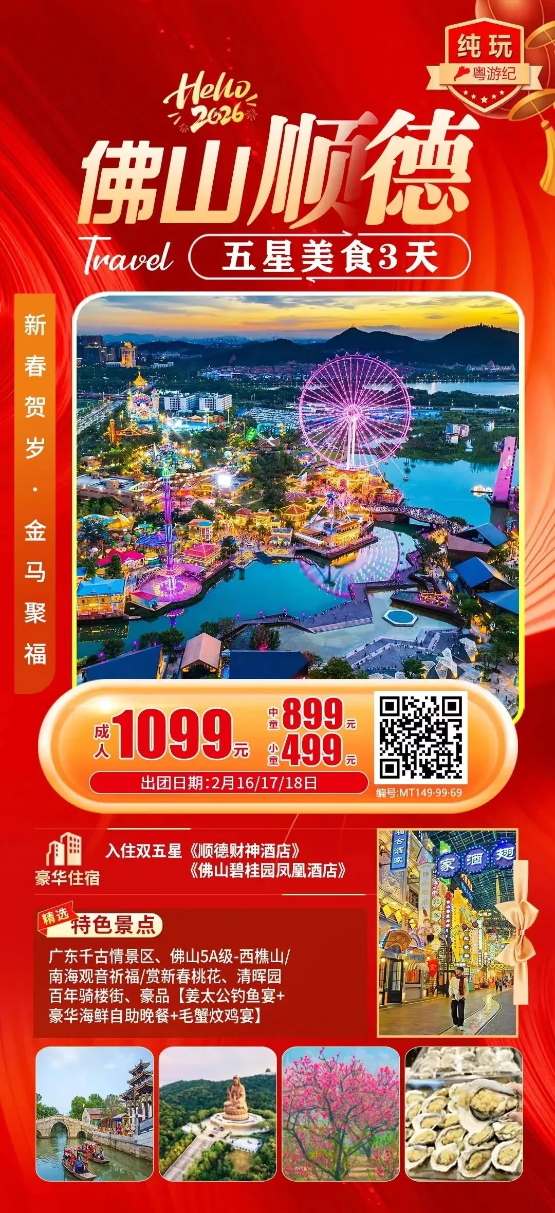 春节深圳周边游3天~广东千古情景区、佛山5A级-西樵山、住双五星《顺德财神酒店+佛山碧桂园凤凰酒店》清晖园、百年骑楼街、豪品五星美食