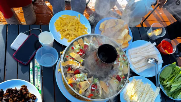 特色雪地火锅:48元/人,4人起订,需提前预订,在雪山间围炉煮火锅,暖胃又暖心。