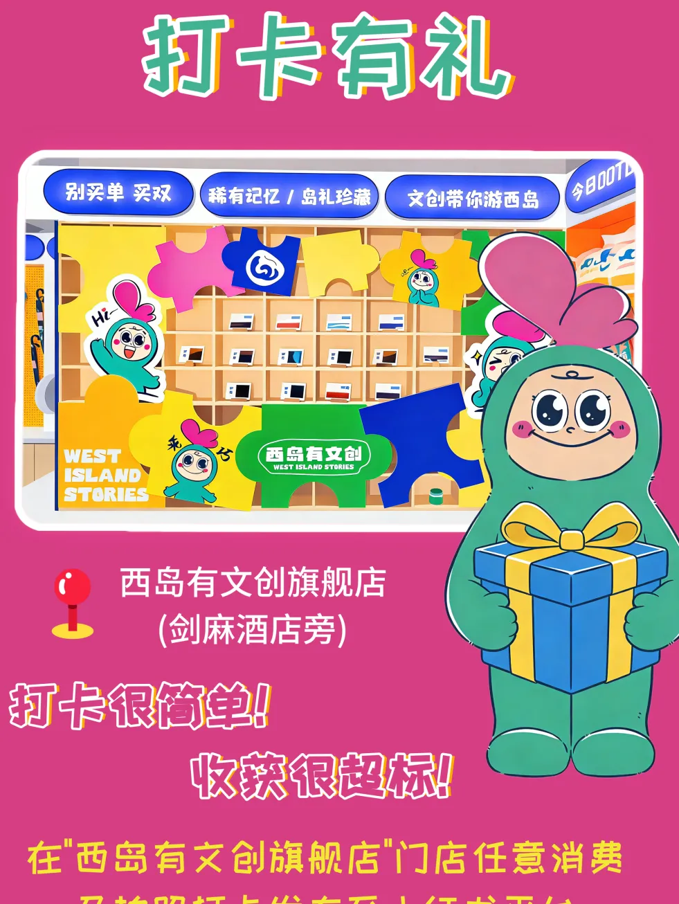 1、在市集消费,凭消费凭证参与趣味"挖金"游戏,收集"西岛币",兑换限定文创礼品!边逛边拿好礼!