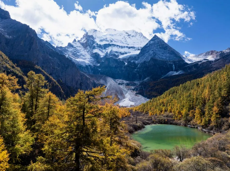 稻城亚丁仙乃日雪山下的湖泊卓玛拉措掩映在彩林中(2025年10月26日摄,无人机照片)。新华社记者江宏景 摄
