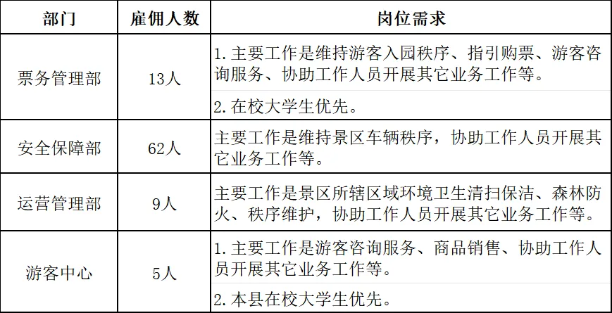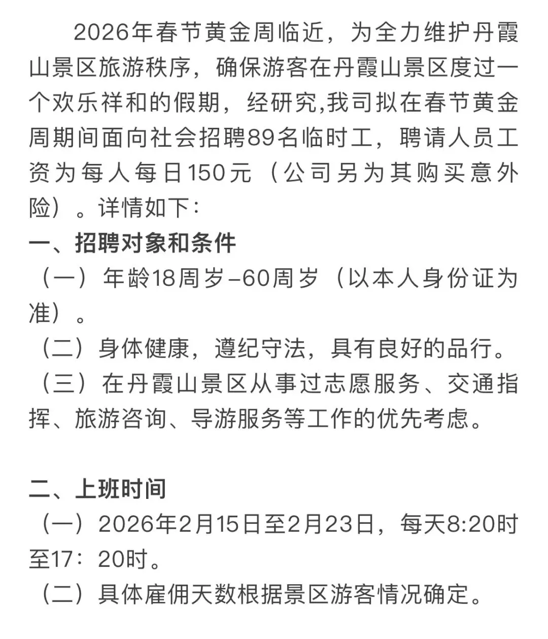 您现在的位置是:首页 > 国内旅游目的推荐 > 正文 国内旅游目的推荐 【招聘】89名临时工!丹霞山景区招聘2026年春节黄金周临时工 admin2026年02月06日 00:08:09国内旅游目的推荐11 【招聘】89名临时工!丹霞山景区招聘2026年春节黄金周临时工三、招聘岗位四、报名时间及方式(一)报名时间:2026年2月5日至2月9日8:20时至17:20时。(二)报名方式:电话报名,报到时需携带本人身份证和银行卡(原件及复印件)。(三)联系电话票务管理部:0751-6296018安全保障部:0751-6293678运营管理部:0751-6298800游客中心:0751-6293812韶关市丹霞山旅游投资经营有限公司2026年2月5日来源:丹霞山旅游 转载请说明来源于"旅荐网",部分内容转载自网络,如有侵权请联系qlwl@foxmail.com删除 本文地址:https://www.15386.cn/post/95071.html 上一篇 主理人,安庆范儿|聂志民:把景区变戏台 让年轻人爱上黄梅戏 下一篇 【文化旅游】六天五晚伊春冬季旅游线路盘点!总有一条适合您! 相关文章 你报名了吗?2026 DMC旅游展·招商进行中,国旅业B2B精准对接平台,邀您同行 2026年山东旅游指南:揭秘本地TOP3地接社的专业服务与口碑排名 新年旅游|芜湖亲子2天1晚省钱旅游指南1 三月免票景区全攻略|全国+河南精选,错峰春游不花冤枉钱 旅游避坑指南|远离乱象,安心出游! 2025全年旅行指南计划表\速存抄作业️ 涂尔贝睡眠保健凝胶(旅游装1g)使用方法技巧 #户外旅行穿搭 #夏日防晒攻略 #亲子时光记 埃及旅游提早准备攻略篇之出行必备 春满舜陵花正开——运城舜帝德孝文化旅游景区全攻略 发表评论 取消回复 评论列表 这篇文章还没有收到评论,赶紧来抢沙发吧~