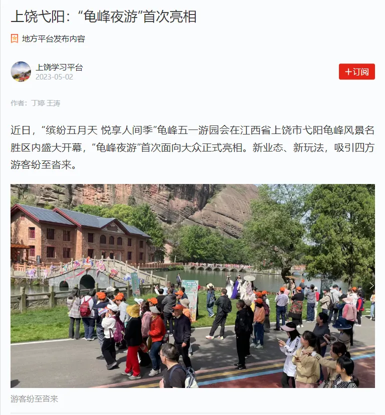 到目前为止龟峰景区“以文旅融合富民惠民乐“、“五一相约龟峰,来赏乌龟乐园”、“龟峰侠客行,致敬五一劳动者”、"龟峰夜游 首次亮相“、”浪漫龟峰 一眼千年“、”龟峰霞客线 等你来打卡“等作品被学习强国等中央主流媒体相继报道。龟峰景区加大了宣传力度,拓宽了宣传渠道。 2023年已经是第六次登上学习强国平台,在全国范围受到广泛关注。