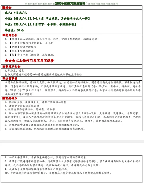 如人数不够,出发前(或出大交通票:如机票\火车票\船票)提前一天告知不够最低成团人数不发团并全额退款,无其他赔偿,敬请留意。
