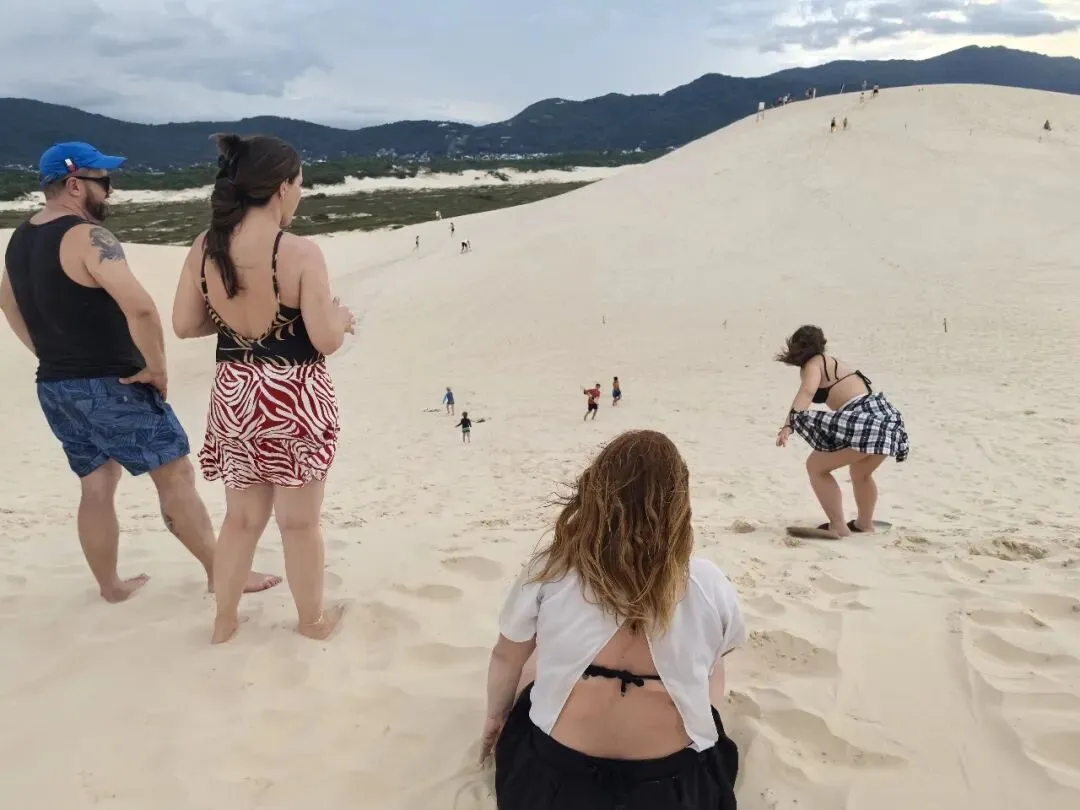 Dunas da Joaquina像是一个小型沙漠。这里的娱乐项目就是滑沙,从高高沙堆上踩着滑板滑下来。因为都是沙子,就算跌倒也完全不会受伤,而且速度很慢。板子可以在现场租,有踩着的滑板,也有坐着的滑板,四十雷租一个小时。话说巴西这边很多游乐设施都说多少钱玩多久,但其实从来不会去计时的,只要不是太离谱,没人会追你还。比如说好半小时玩1个小时,说好1个小时玩2个小时,没有任何问题。