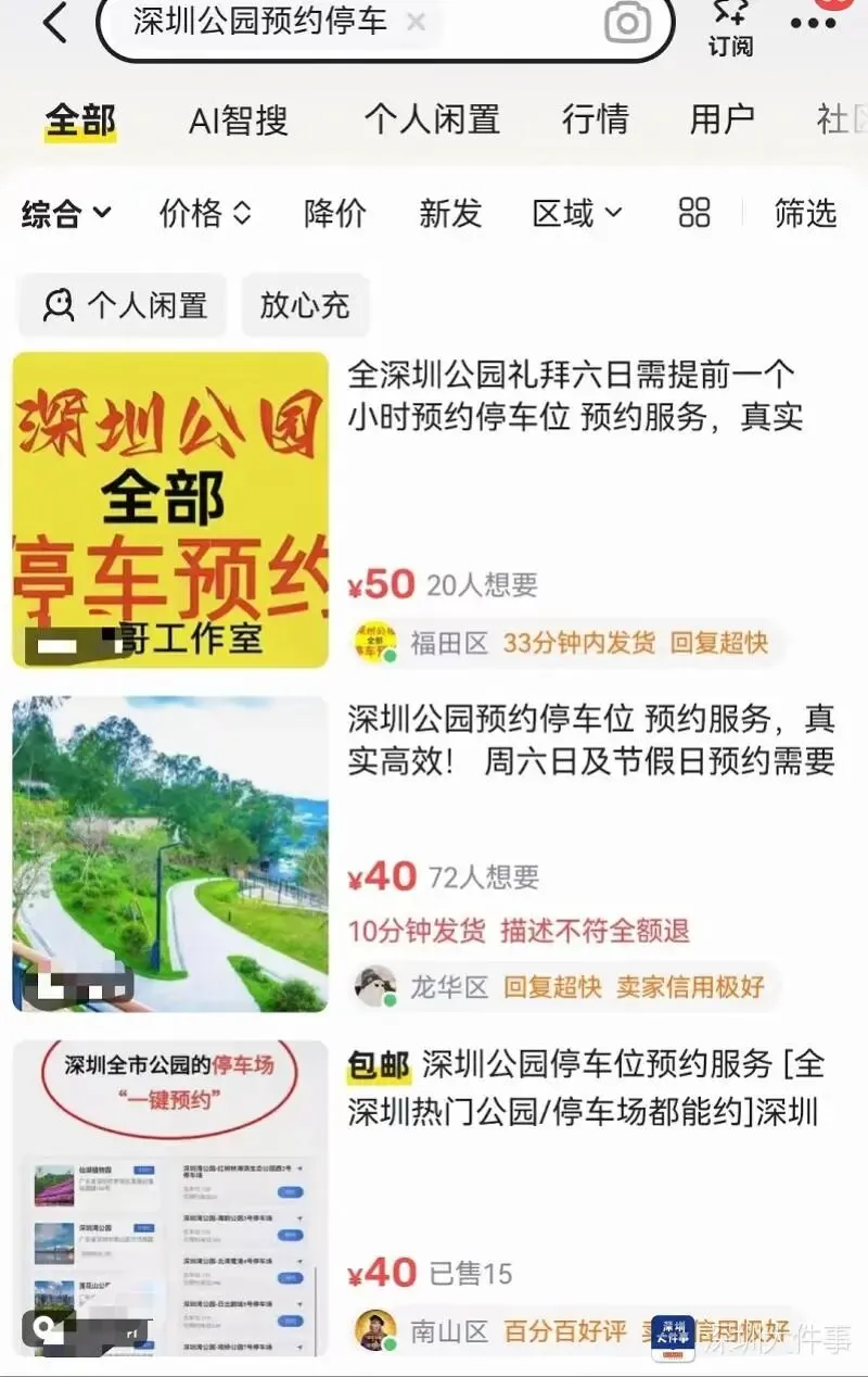 还有网友透露,在某二手交易平台APP检索“深圳公园停车”,可搜索到不少提供“深圳公园预约停车服务”的卖家,手续费30-50元不等,不含实际停车费。