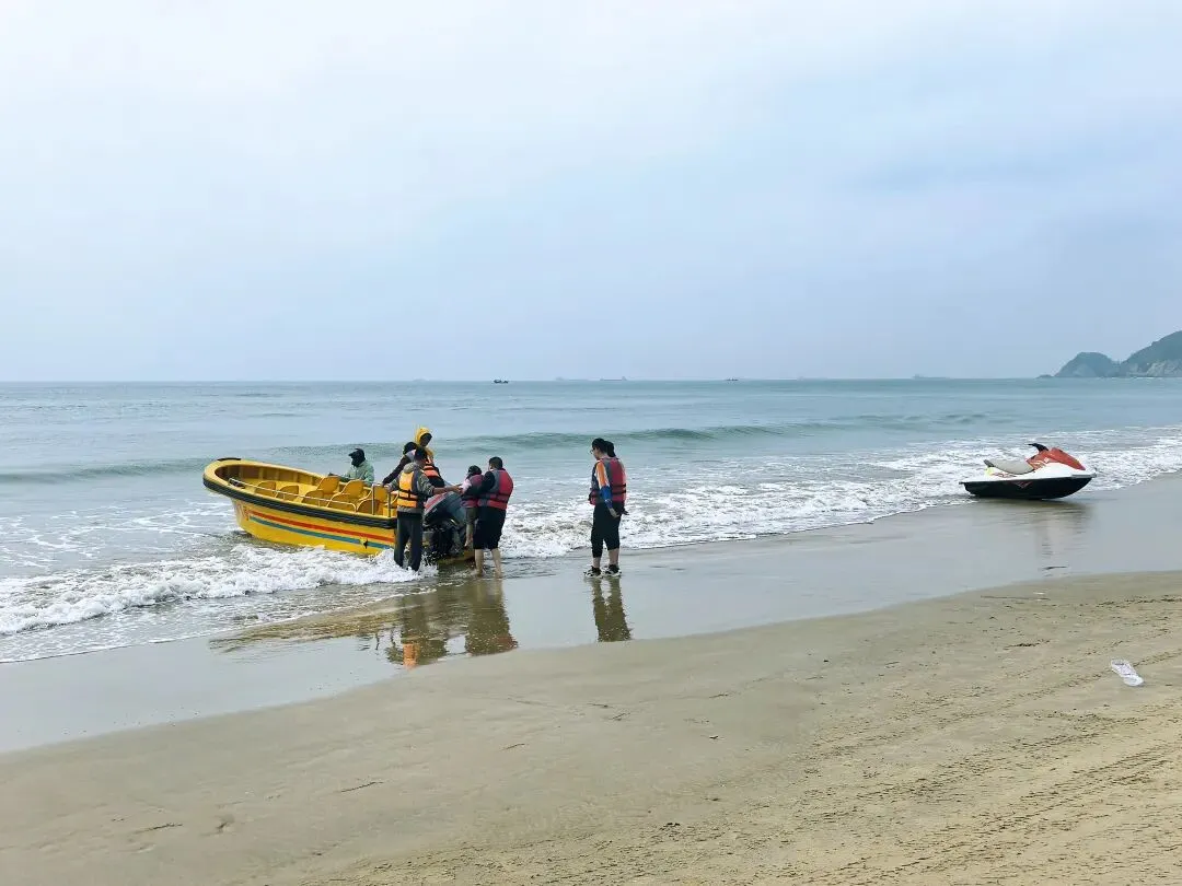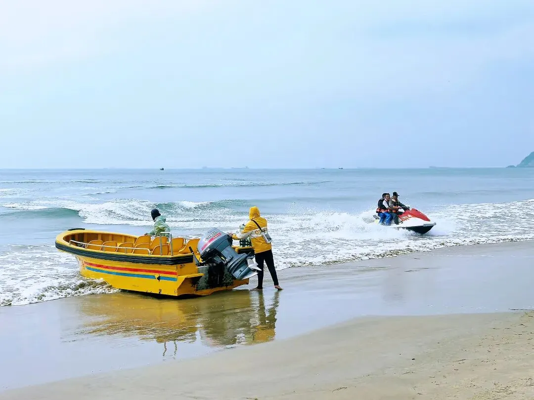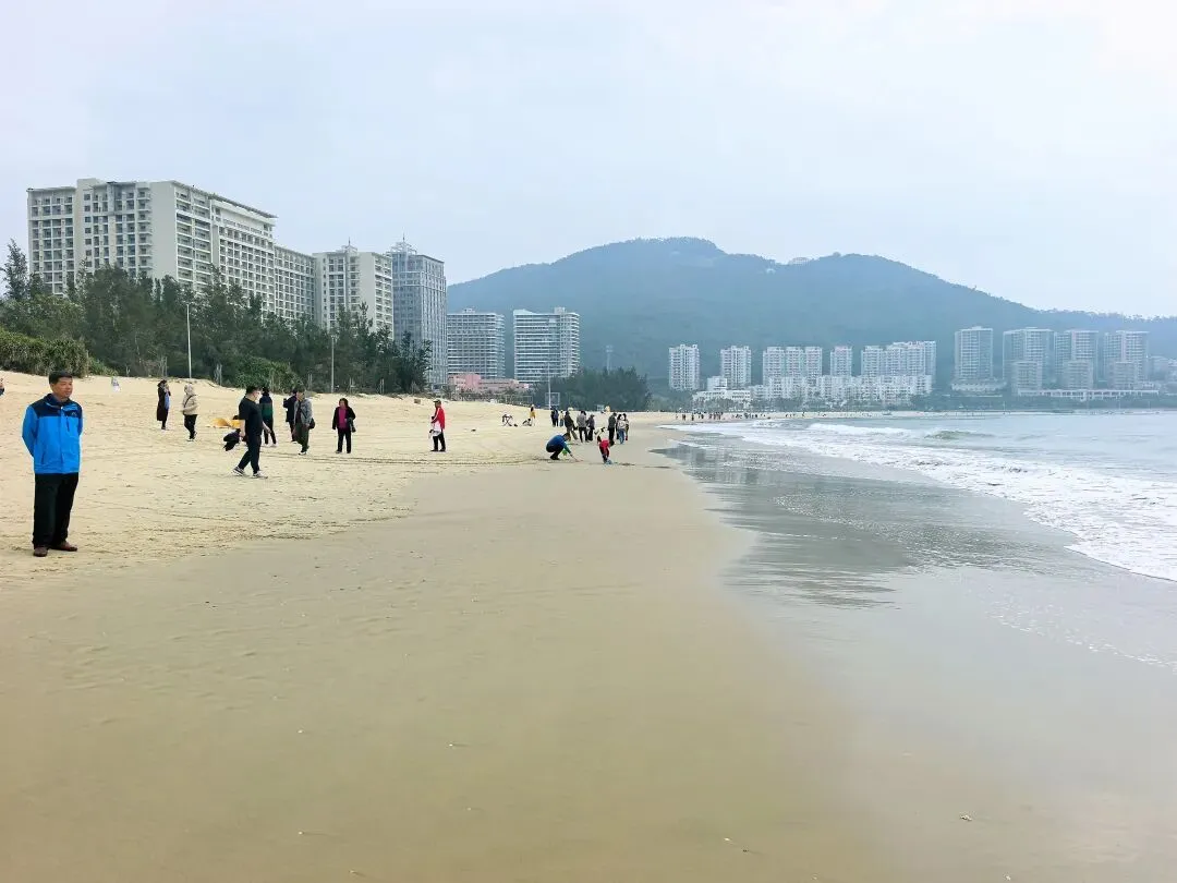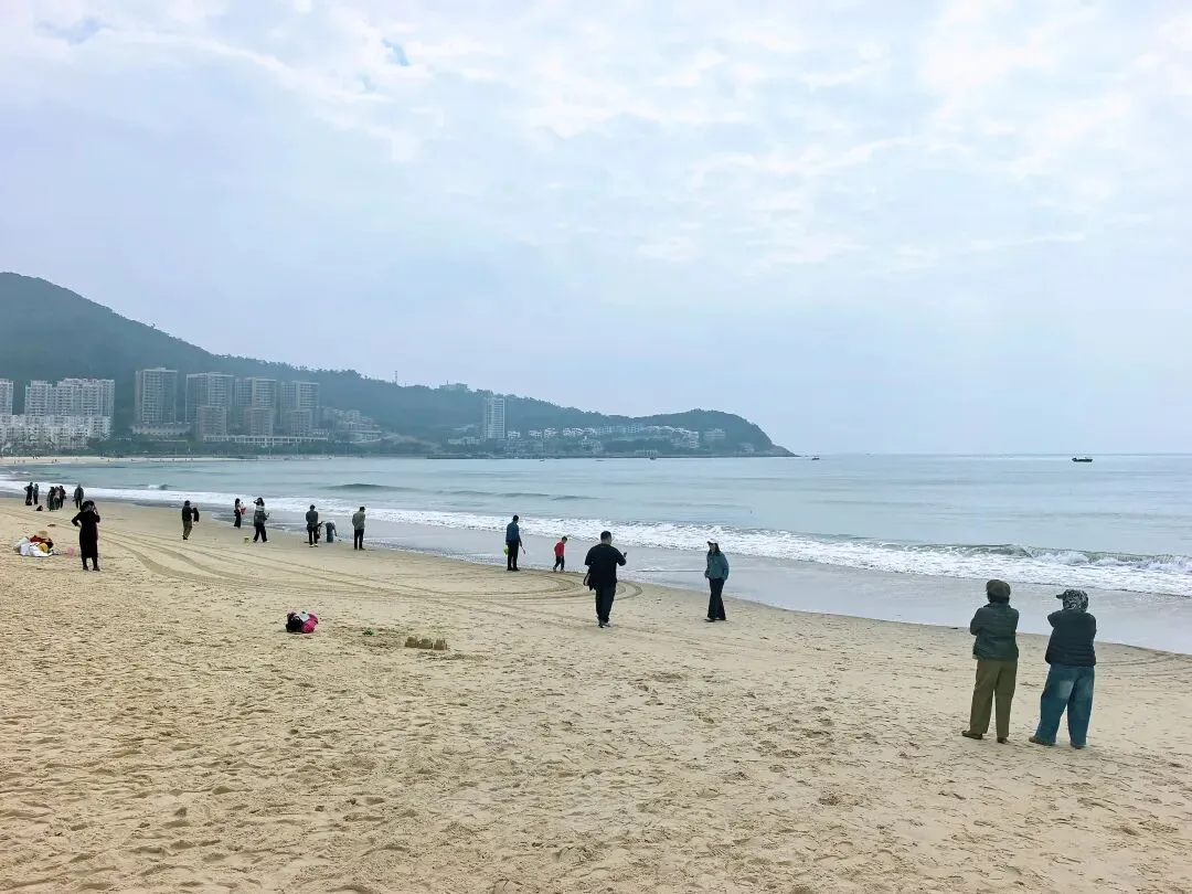 去海陵岛游玩,没人能忽视大角湾的知名度,所以这里是所有登岛游客必打卡之地。虽然已经看惯甚至看腻了海滩,大角湾的海滩还是魅力十足,令人忍不住要插足踏浪。游客们直觉回避被圈起来的收费区域,因为免费的开放区域足够大家游玩。这个冬季走过很多海滩了,这是我唯一看到依旧开展水上项目的景区,尽管只是组织游客乘坐摩托艇或渔船出海。