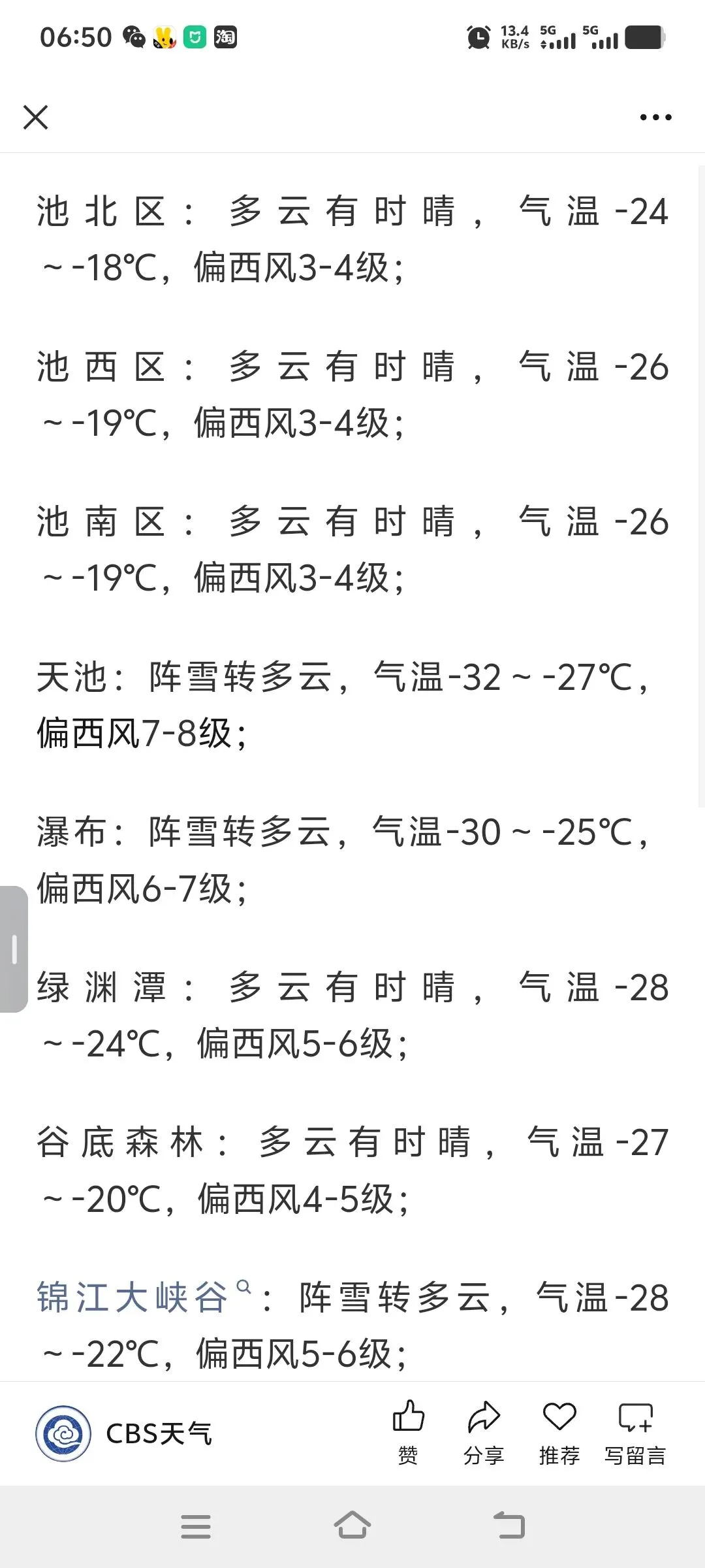 长白山气象台 2月6日 天气预报