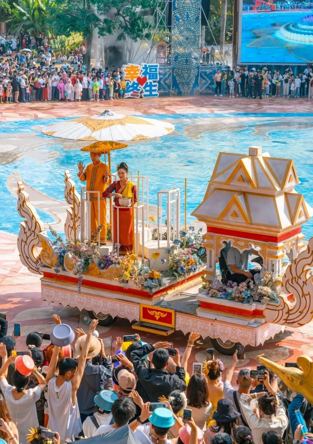 活动内容:春节期间,我们在泼水广场为您准备了盛大的泼水狂欢活动。让晶莹的水花带走一年的疲惫和烦恼,在欢声笑语中祈求新的一年平平安安、事事如意。拿起水盆,加入这场泼水盛宴,切身体验“泼湿全身、幸福终生”的最美好祝福;跟随激情欢腾的傣迪,在象脚鼓的节奏与电子音乐奇妙结合中,抛去一切烦恼,忘情舞动。
