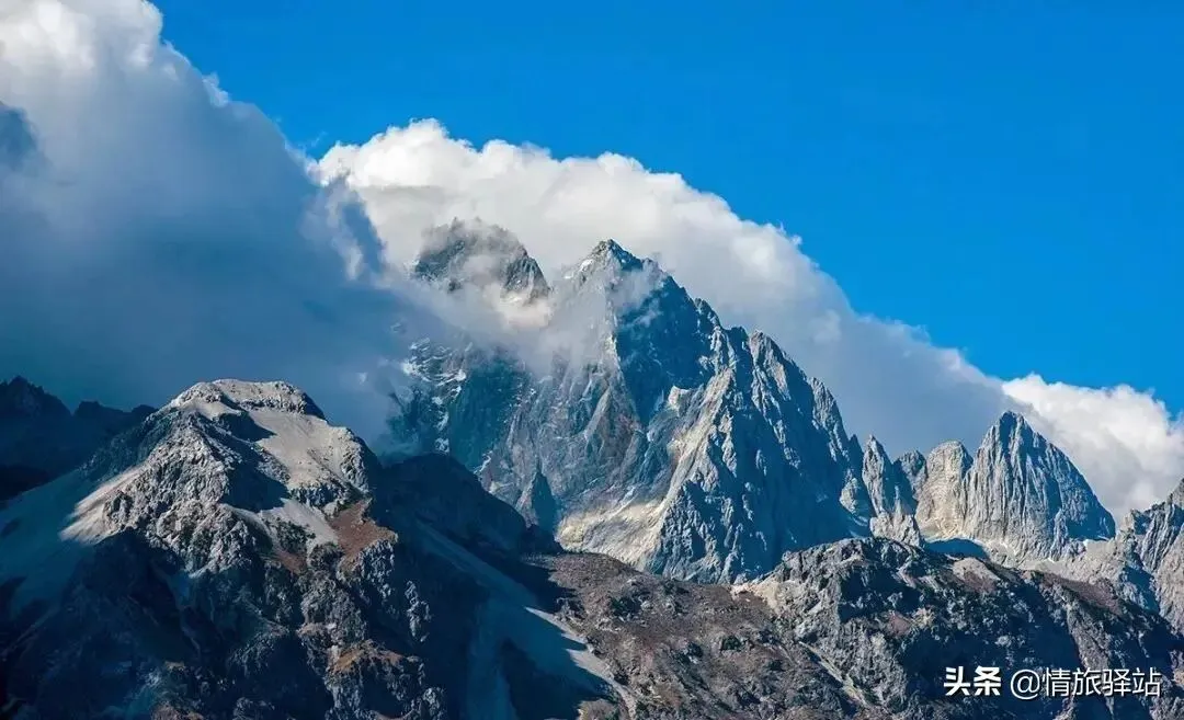 玉龙雪山位于丽江坝北边,整座雪山由十三峰组成,由北向南呈纵向排列,延绵近50公里,东西宽约13公里。玉龙雪山不仅气势磅礴,而且秀丽挺拔,造型玲珑,皎洁如晶莹的玉石,灿烂如十三把利剑,在碧蓝天幕的映衬下,像一条银色的玉龙在作永恒的飞舞,故名玉龙山。