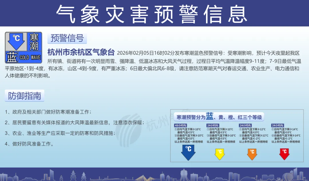 余杭区气象台2月5日15时发布的预报:今天傍晚阴有时有小雨,有霾,夜里到明天阴有中到大雨(雪),明天上午起山区转雨夹雪或雪,高山区有大到暴雪,下午起平原地区转雨夹雪或雪,后半夜雨雪渐止转阴;后天阴转多云。明天最低气温0度,山区-2到0度,明天最高气温9度。