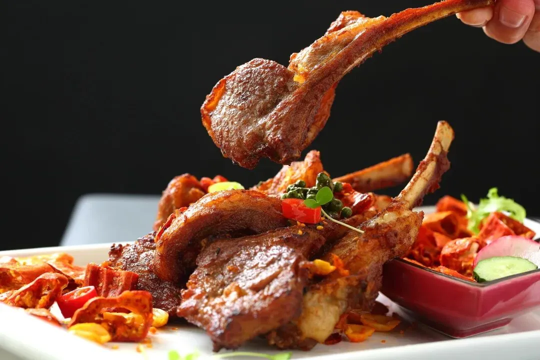 涞源的特色羊肉料理,是这场盛宴当仁不让的主角。炙烤羊鞍选用本地散养山羊的七至八肋精华,肉质细嫩多汁,经秘制酱料慢腌入味后,果木炭火炙烤至外皮金黄焦香,一刀切下,丰腴的肉汁瞬间迸发,脂香与果木清香在口中交织弥漫。