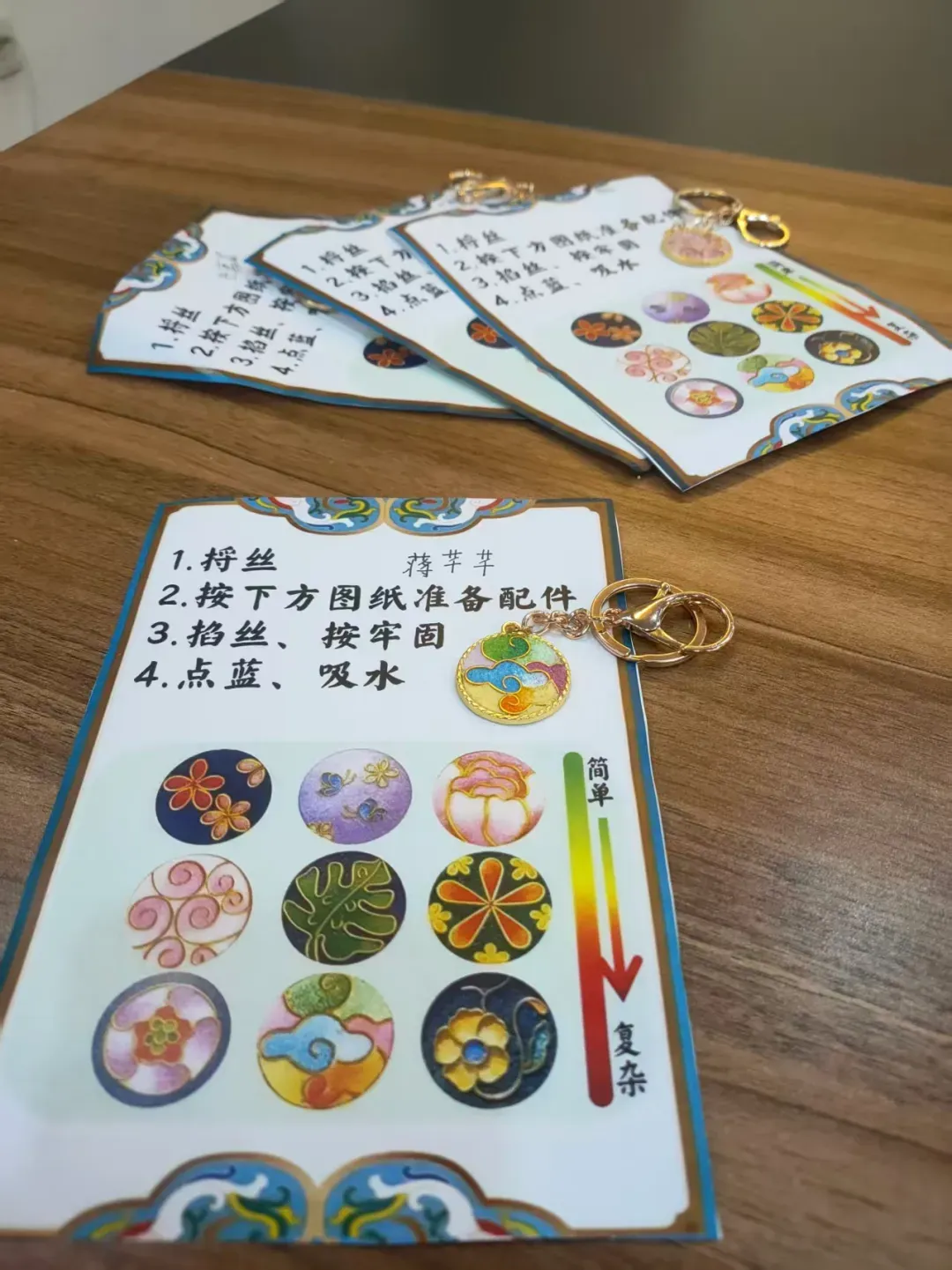 听老师们讲了一上午的课,终于到了动动小手的时刻啦!观效文化掐丝珐琅残障工匠来到体验课,指导孩子细心掐丝,耐心点蓝。在专业老师的帮助下,同学们选出自己最喜欢的图案,将金属细丝按照花纹扭转曲折,掐成图案,再将彩色的釉料填入丝与丝的空隙之间,他们专注的神情,小心翼翼的动作,不仅是手艺的学习,更是对传统工匠精神的切身领悟。
