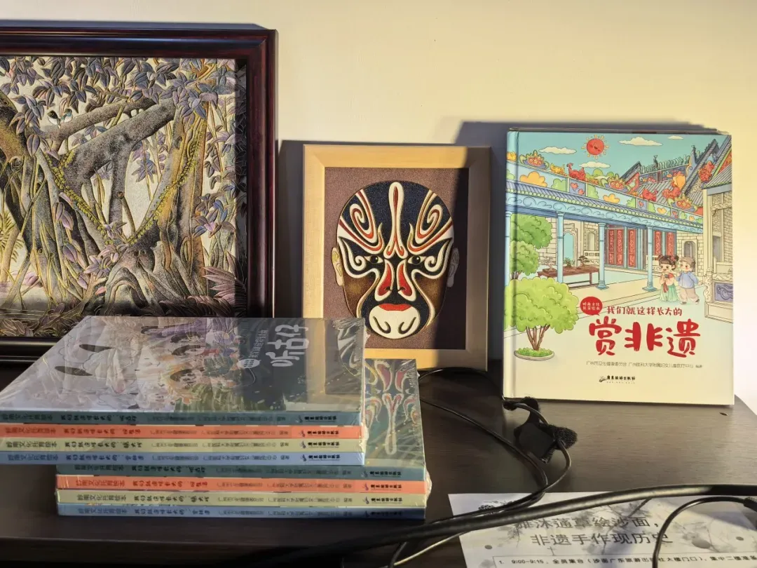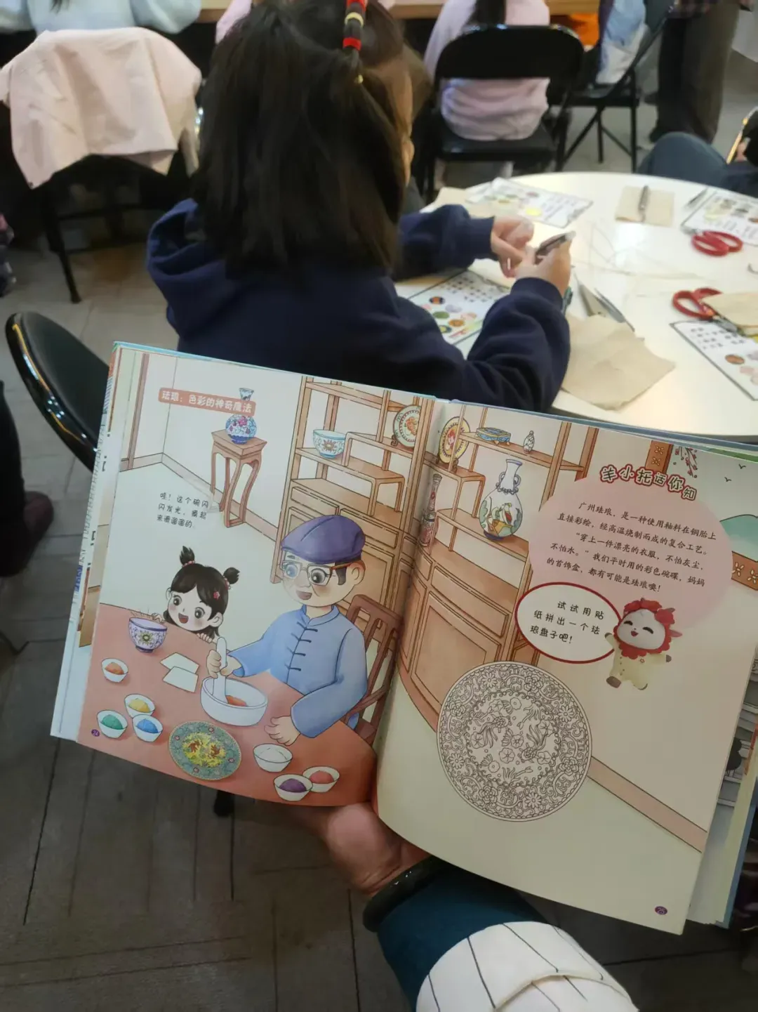 此外,一个小小的角落也备受孩子们青睐。这里摆放着精美的掐丝珐琅工艺画,还有一套由广东旅游出版社携羊城托育打造的《岭南文化托育绘本》。其中一册《我们就这样长大的:赏非遗》介绍了12项广州非遗,孩子们翻阅此书,除看到珐琅和蓪草画外,还能了解广彩、广绣、牙雕……一览精彩的传统艺术。